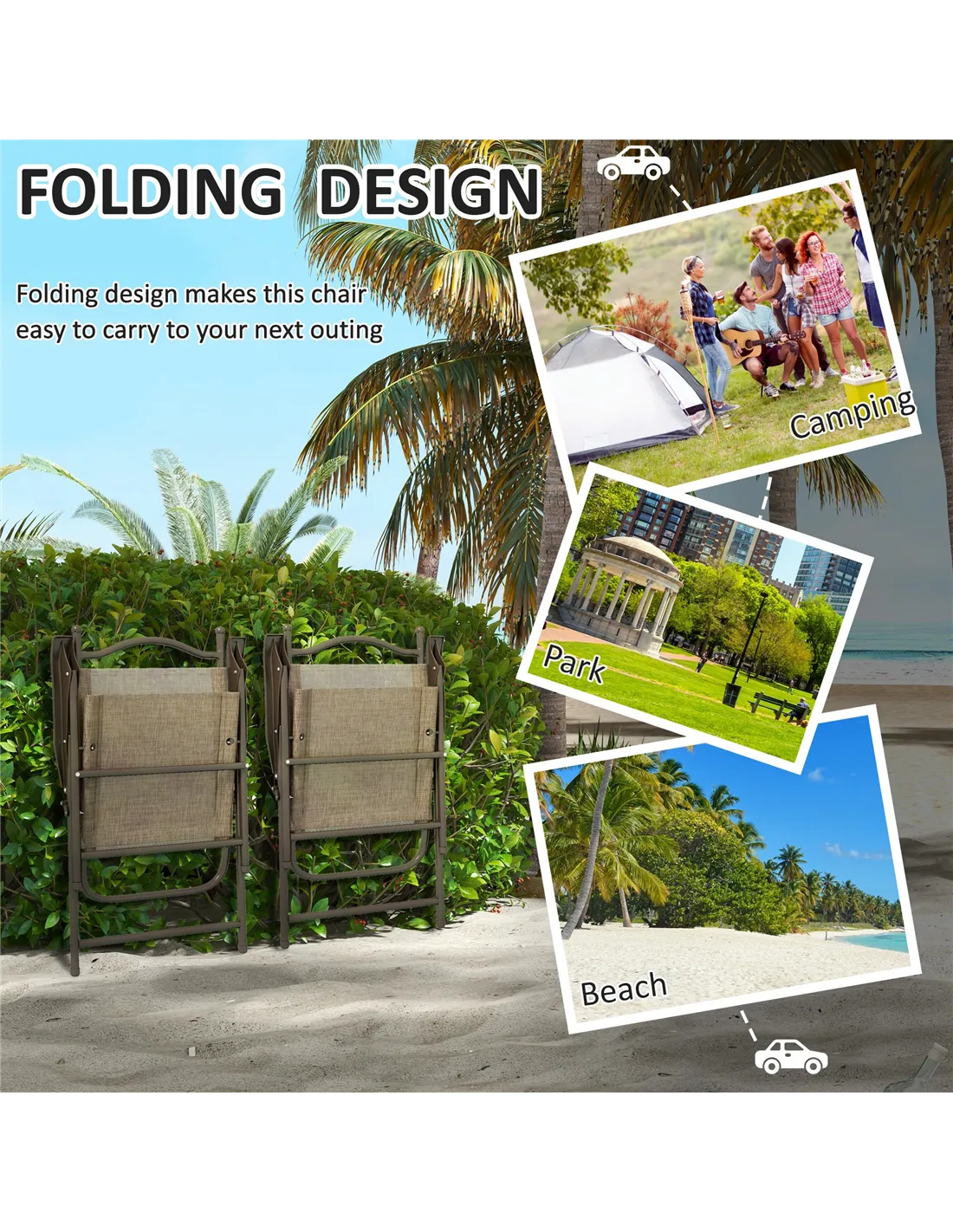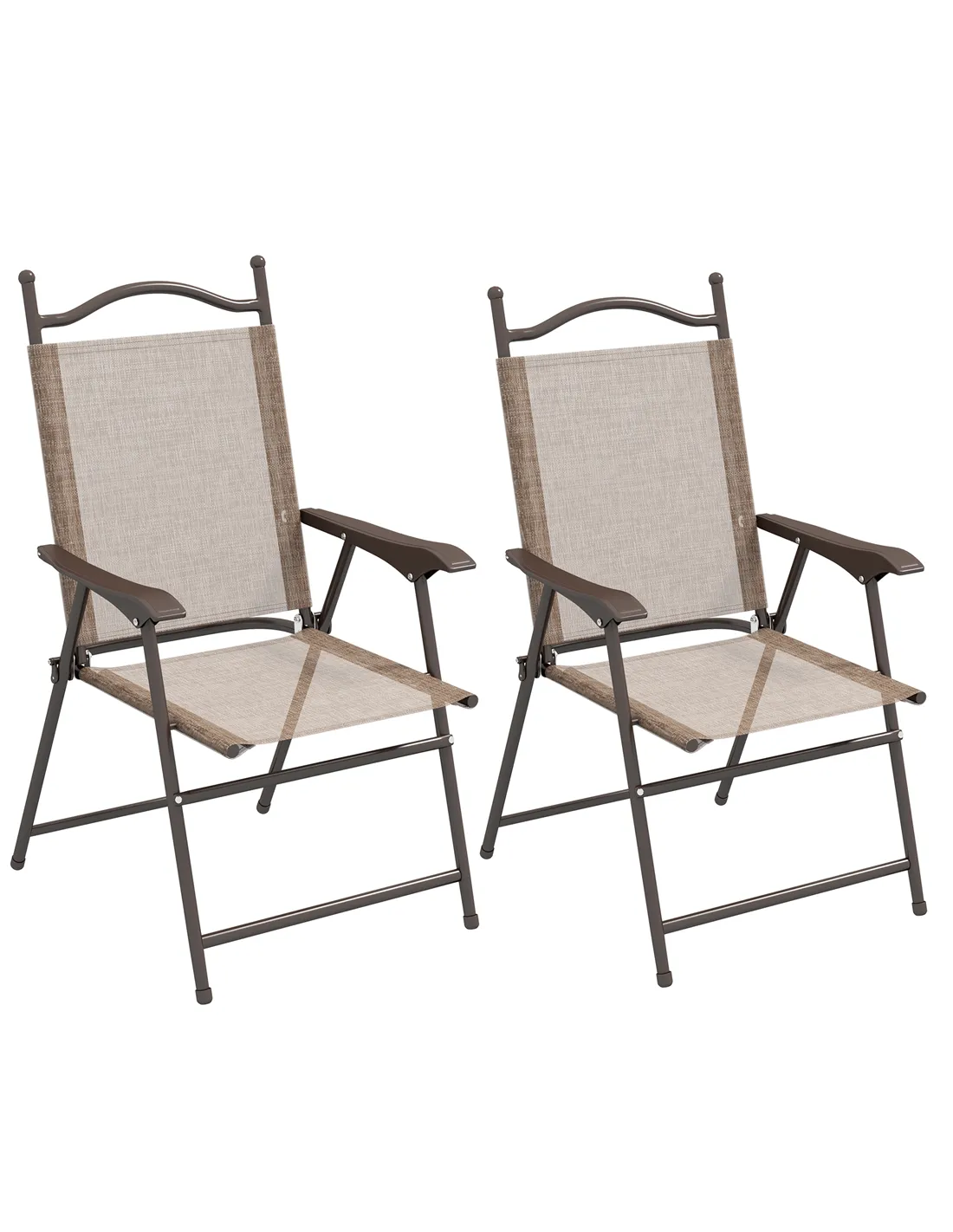 A comfortable seat for outside anywhere. These Outsunny folding chairs are portable designs, so you can take them to many places. Powder coated steel frames are strong and supportive. Tall back and armrests to support your body. Mesh fabric seats keep you comfortable. Two chairs per set.