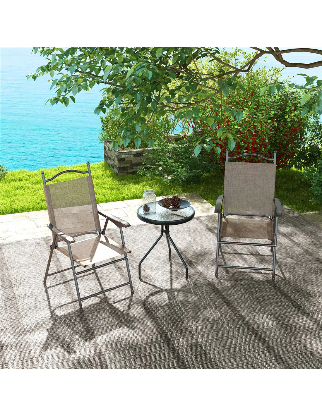 - Suitable for balconies or small terraces where space is limited, as the chairs fold flat for convenient storage when not in use.