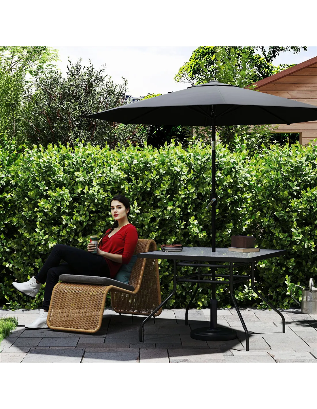 Create a simple yet inviting dining/holding space outdoors, thanks to this Outsunny bistro table. The steel frame creates a strong structure, with the long legs keeping balance at all angles. Fitted with a tempered glass tabletop for a solid holding place, the outdoor table features a middle hole to place and hold a parasol: your market umbrella will keep you shielded from the sun so you can enjoy outdoors for longer. A stylish duo design made for the seasons ahead.