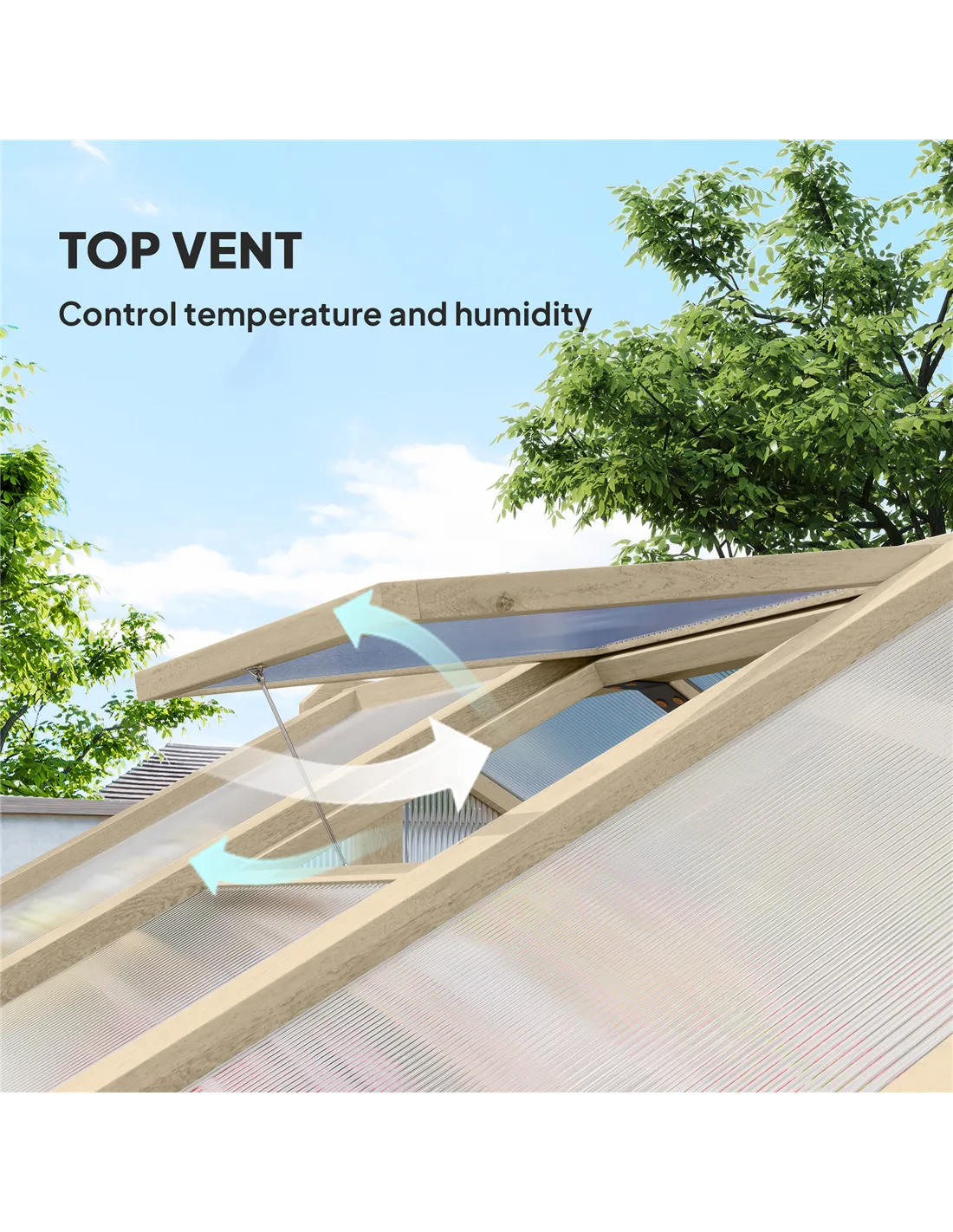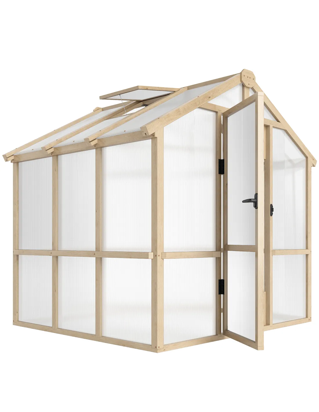 Discover the joy of gardening all year round with the Outsunny Polycarbonate Greenhouse. This walk-in greenhouse features thick panels that trap warmth and sunlight, while the robust fir wood frame ensures stability. Enjoy the control over your plant's growing condition with an adjustable window, ensuring optimal temperature and humidity levels. Ready to grow your garden dreams?