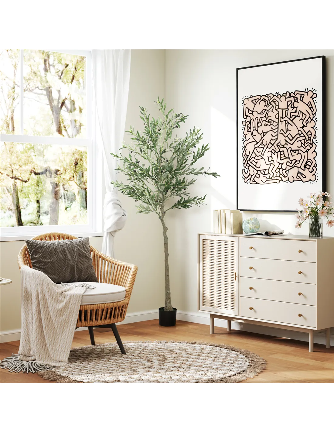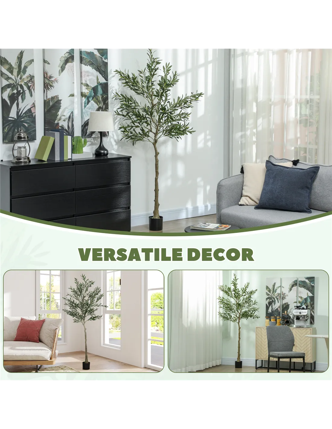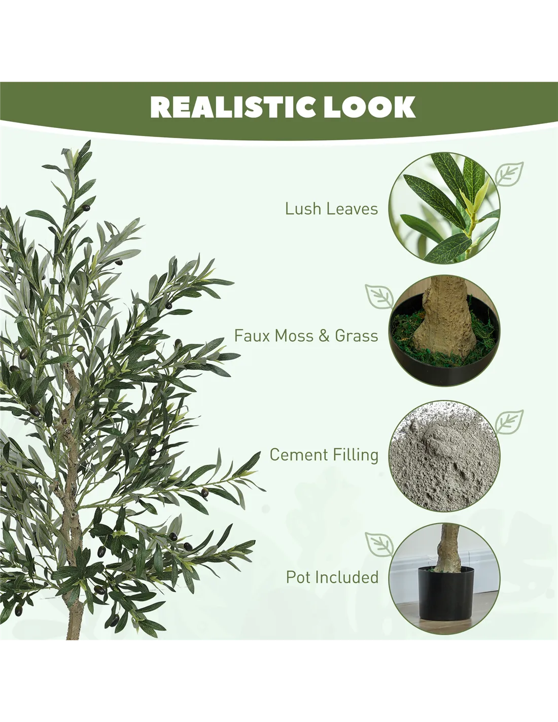 - Realistic look with lush leaves and olives, lifelike trunks, faux moss and grass, mimics natural plants in appearance