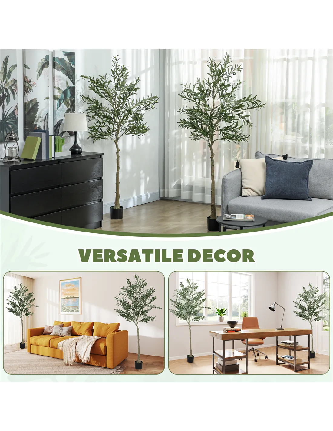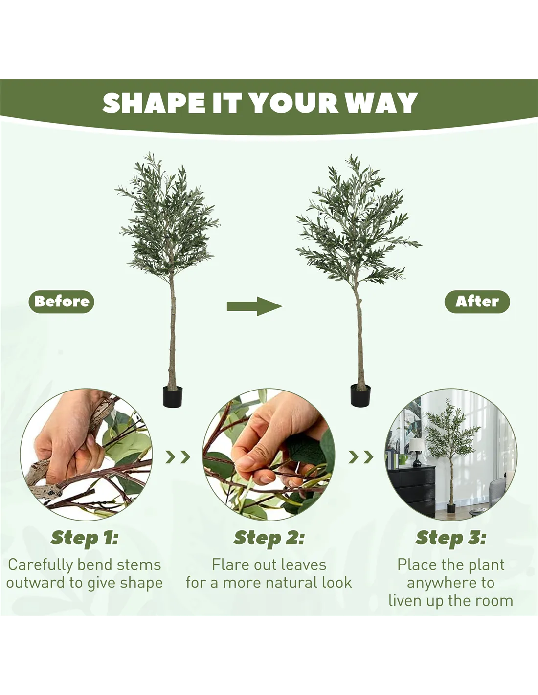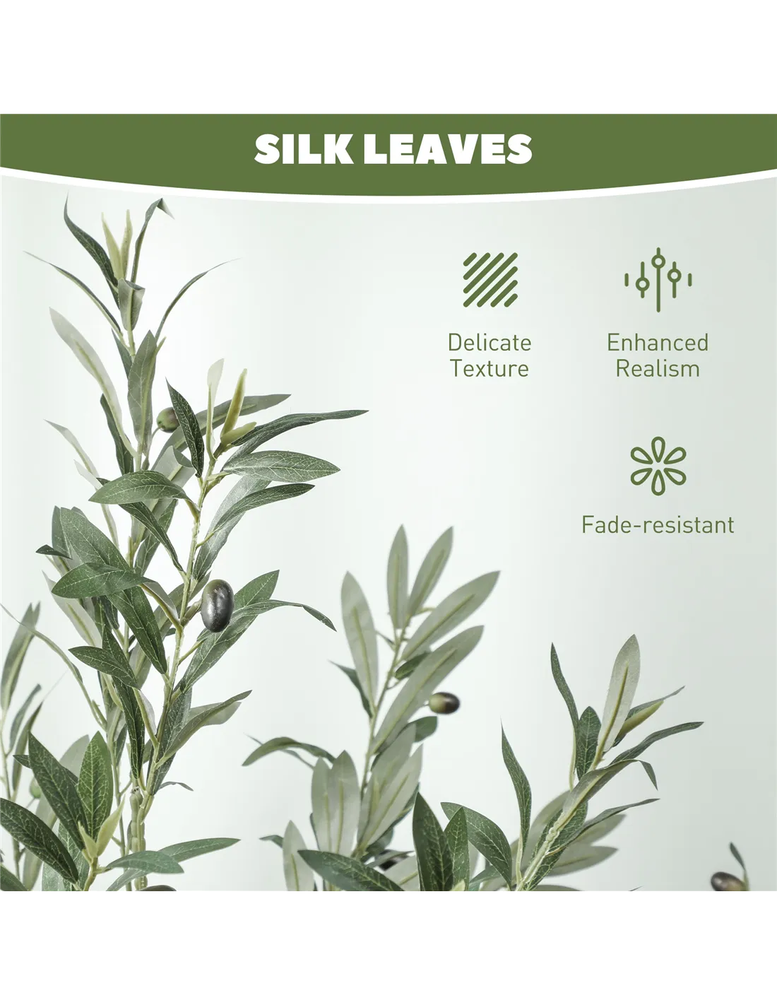 - Realistic look with lush leaves and olives, lifelike trunks, faux moss and grass, mimics natural plants in appearance