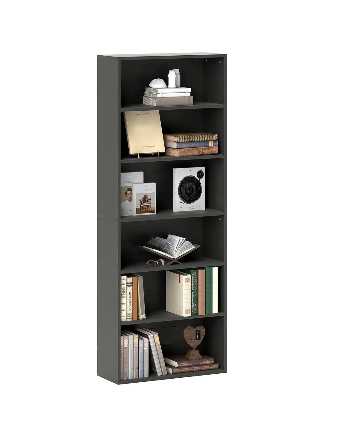 - Six open compartments organise books and decor items, with four adjustable shelves for flexibility