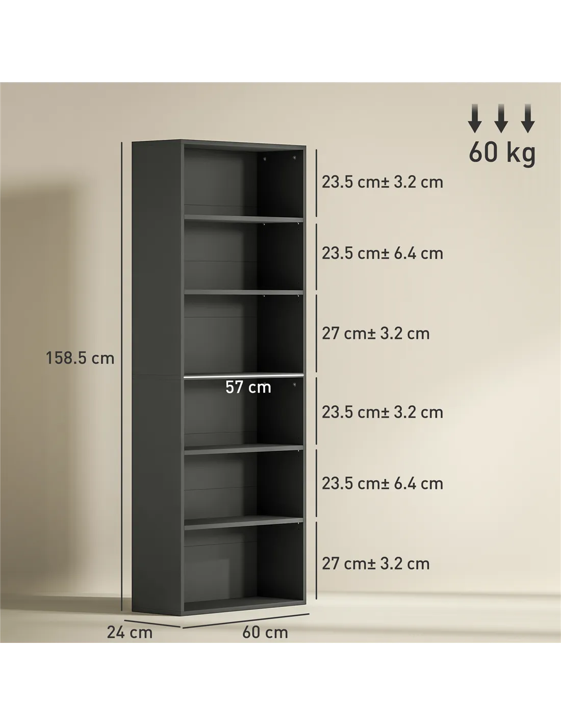 The bookcase supports up to 60 kg in total, with each shelf able to hold approximately 10 kg. - Does the bookcase come with safety features?