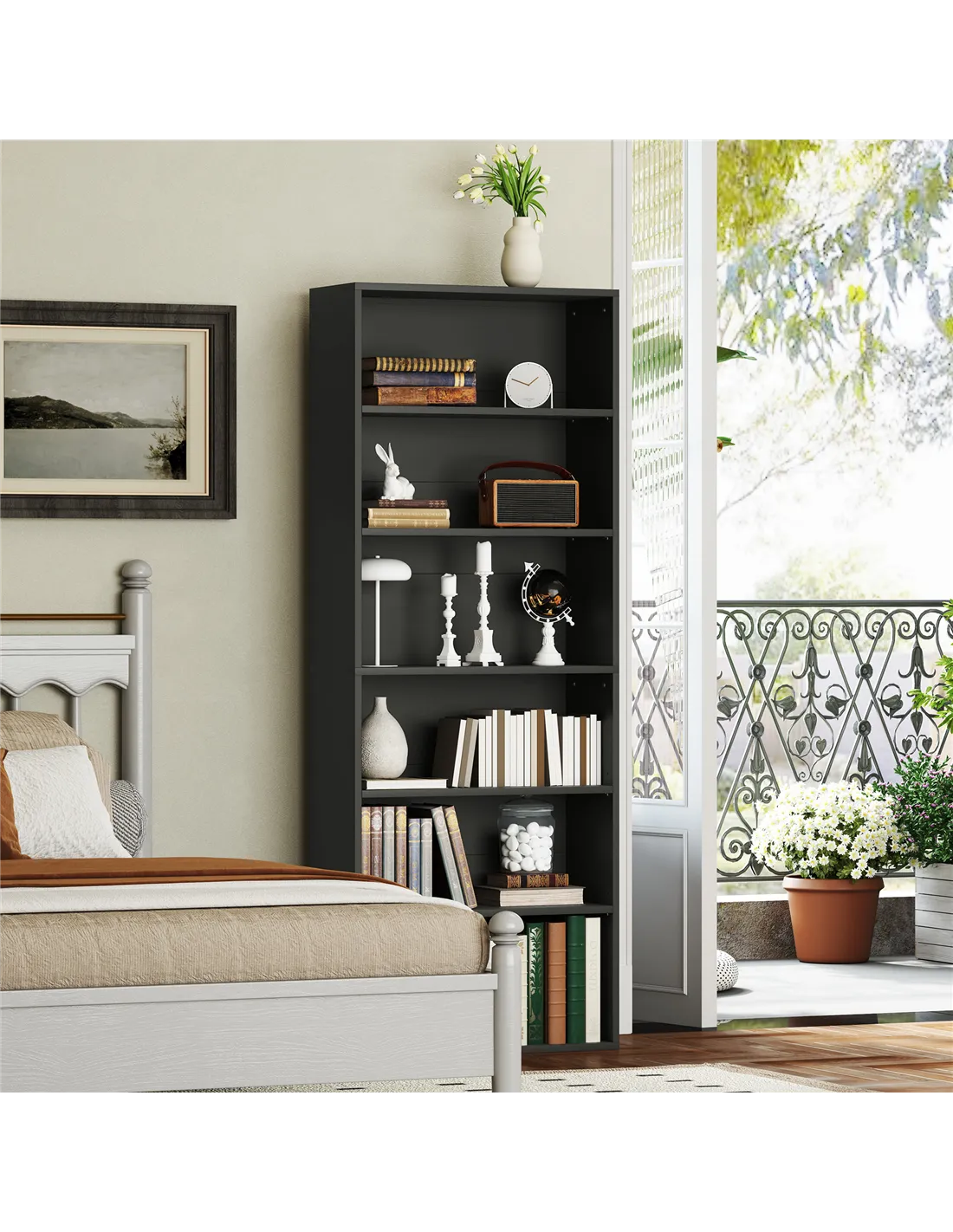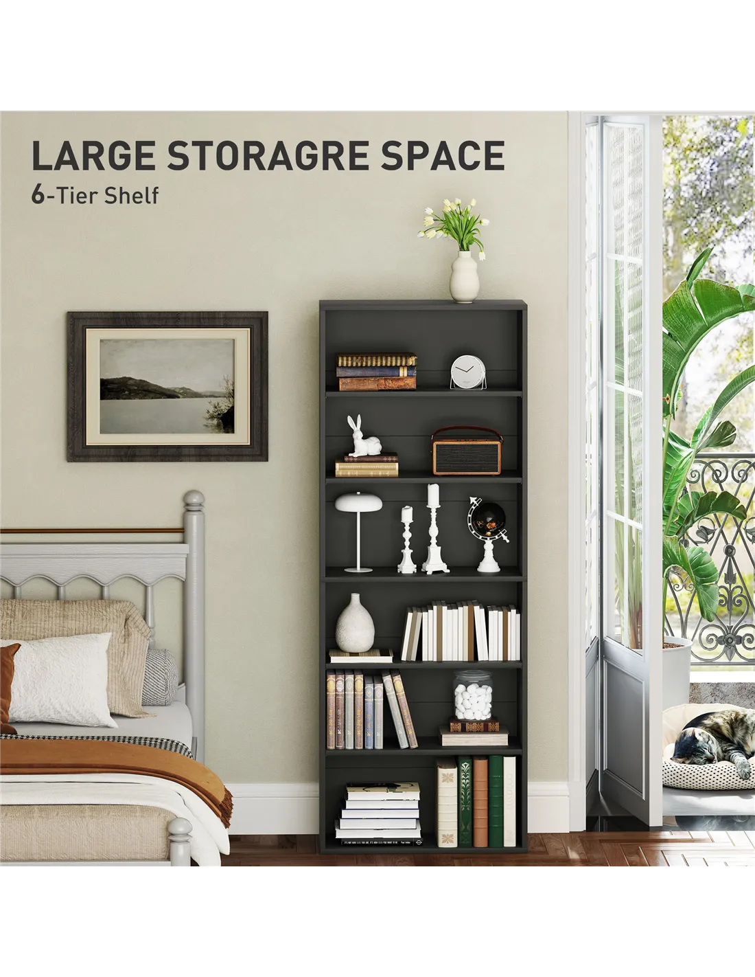 The HOMCOM six-shelf bookcase in black is a versatile storage solution ideal for a variety of living spaces. Perfect for organising books, displaying decorative items, or storing everyday essentials, it fits seamlessly into home offices, living rooms, bedrooms, or even hallways. Thanks to its adjustable shelves, you can customise the layout to accommodate taller items such as vases or photo frames. Its sleek black finish complements modern and classic interiors alike, making it a practical yet stylish addition to any room.