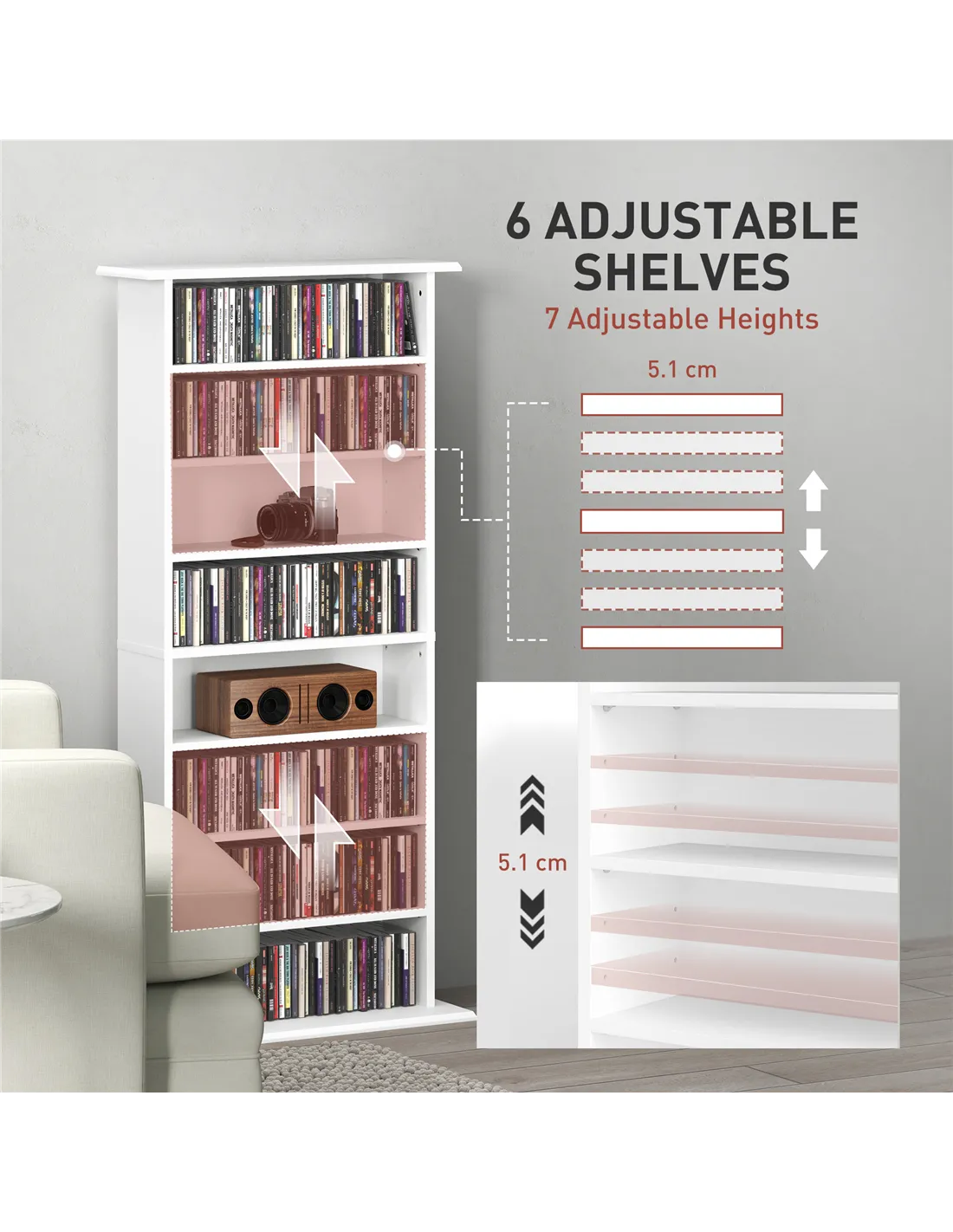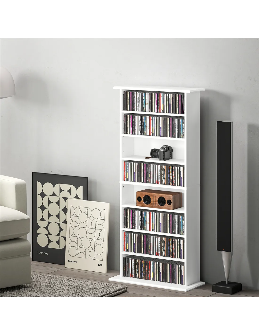- 8 compartments, with 6 adjustable shelves: room for 360 CDs, 185 DVDs or 185 Blu-rays