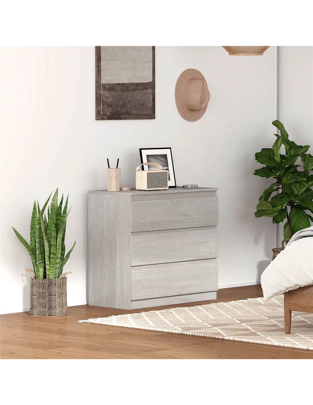 The HOMCOM Chest of Three Drawers in Grey Wood Effect is a versatile storage solution ideal for bedrooms, guest rooms, or even home offices. Its sleek, handle-less design and neutral grey finish complement modern and minimalist interiors, making it perfect for organising clothing such as t-shirts, trousers, and underwear, or storing stationery and personal items. The flat top surface provides additional space to showcase decorative pieces, family photos, or bedside essentials. Thanks to its compact dimensions, it fits comfortably in smaller rooms or under windows, optimising space without compromising style.