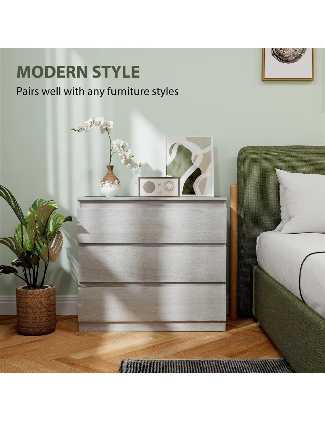 Add some style and organisation into the bedroom - do it with this HOMCOM dresser. Features three drawers for plenty of storage - keep tees, tops, trousers, underwear and more stored together. Made from particle board, it's stable enough for everyday use, with a flat top to offer display room. Comes with anti-tipping straps for safety.