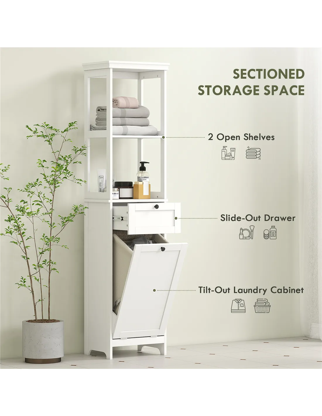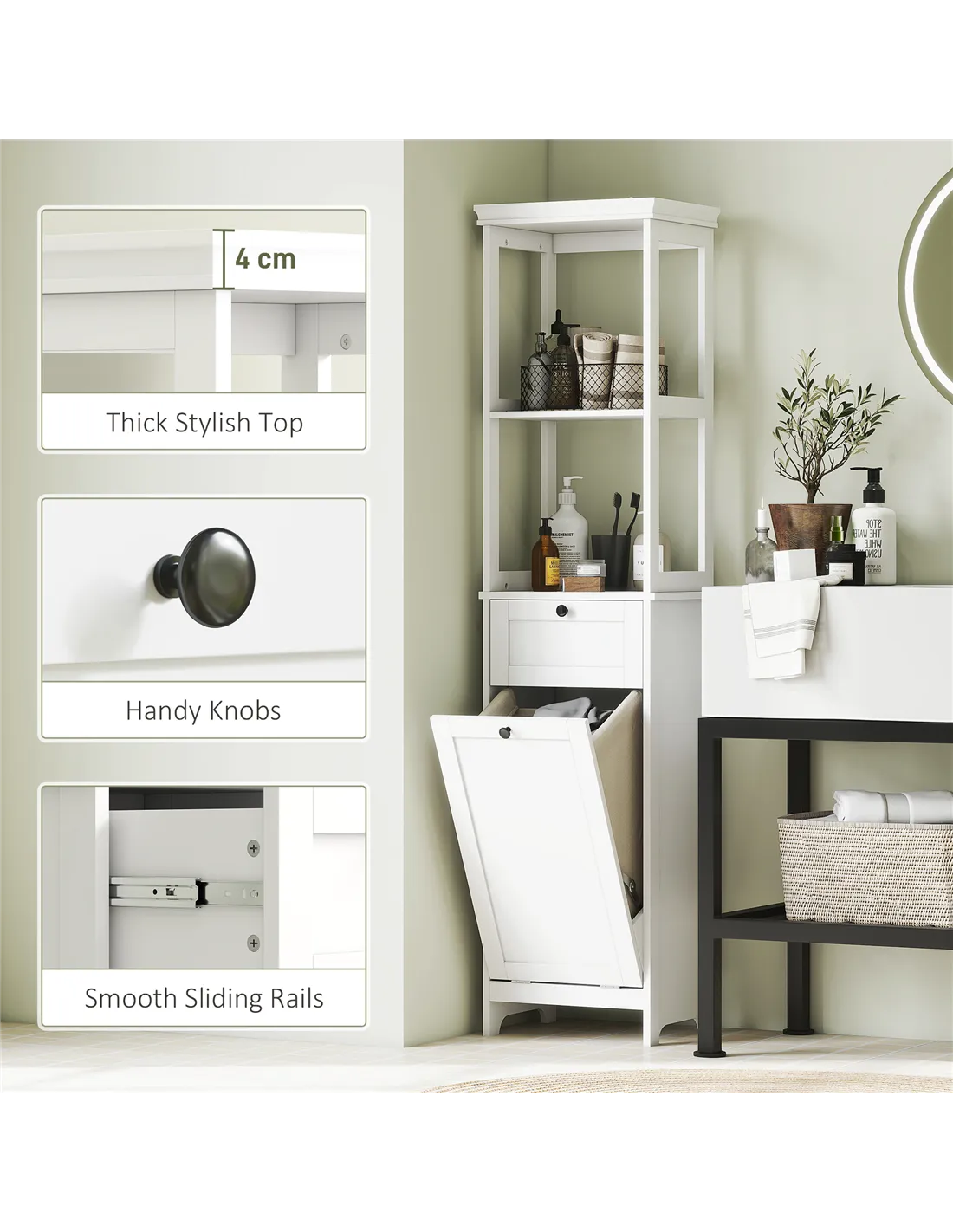 - 30 L tilting bottom hamper to keep dirty clothes stored together. Removable basket to carry to washing machine