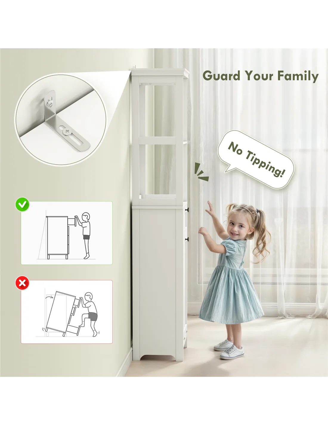 - Anti-tipping kit to securely attach to walls