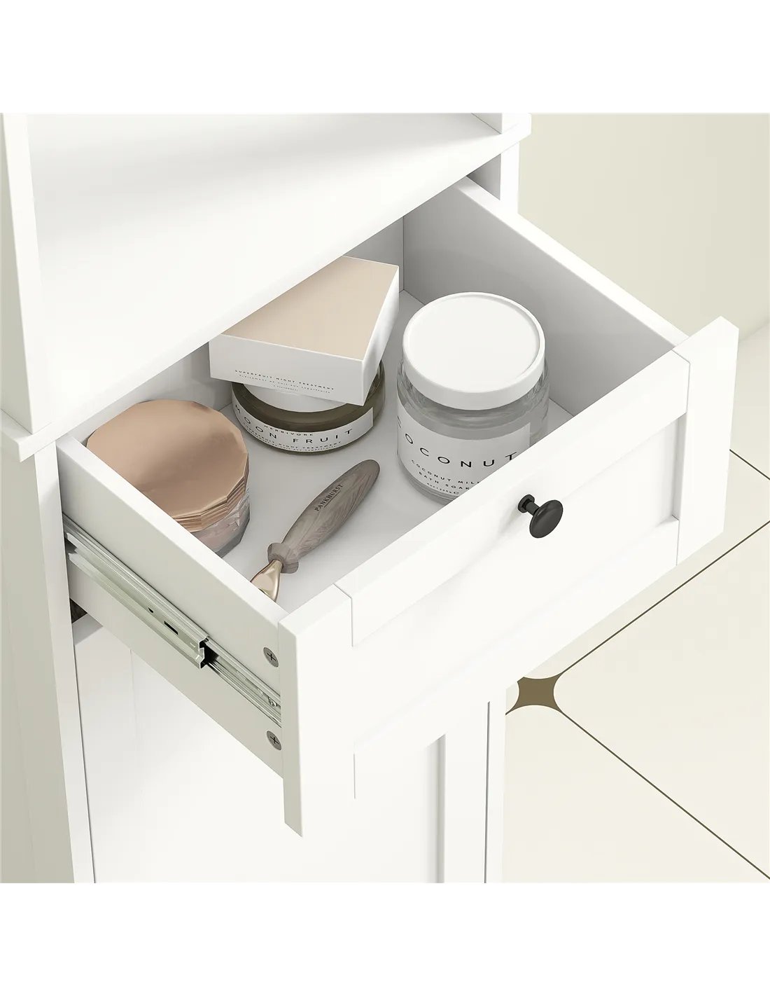- The middle drawer is perfect for storing smaller essentials such as hair accessories, razors, or cleaning supplies, ensuring easy access.
