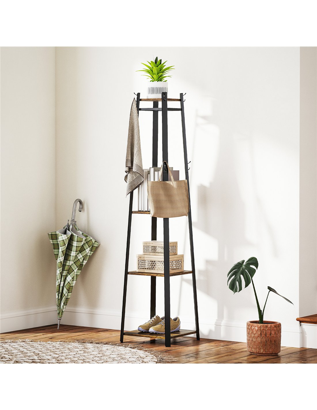 The HOMCOM Compact Freestanding Coat Rack in Black/Brown is an excellent solution for maximising storage in hallways, bedrooms, or compact living spaces. Its corner-friendly trapezium shape fits neatly into tight spots, making it ideal for flats or smaller homes across the UK. Use the eight double hooks to hang coats, scarves, hats, and bags, while the three lower shelves and top shelf provide practical space for shoes, storage boxes, or decorative items. Thanks to its sturdy steel frame and durable MDF shelves, this rack supports everyday essentials with ease. Whether placed near the front door for quick access or in a bedroom for organising accessories, it blends functionality with style.