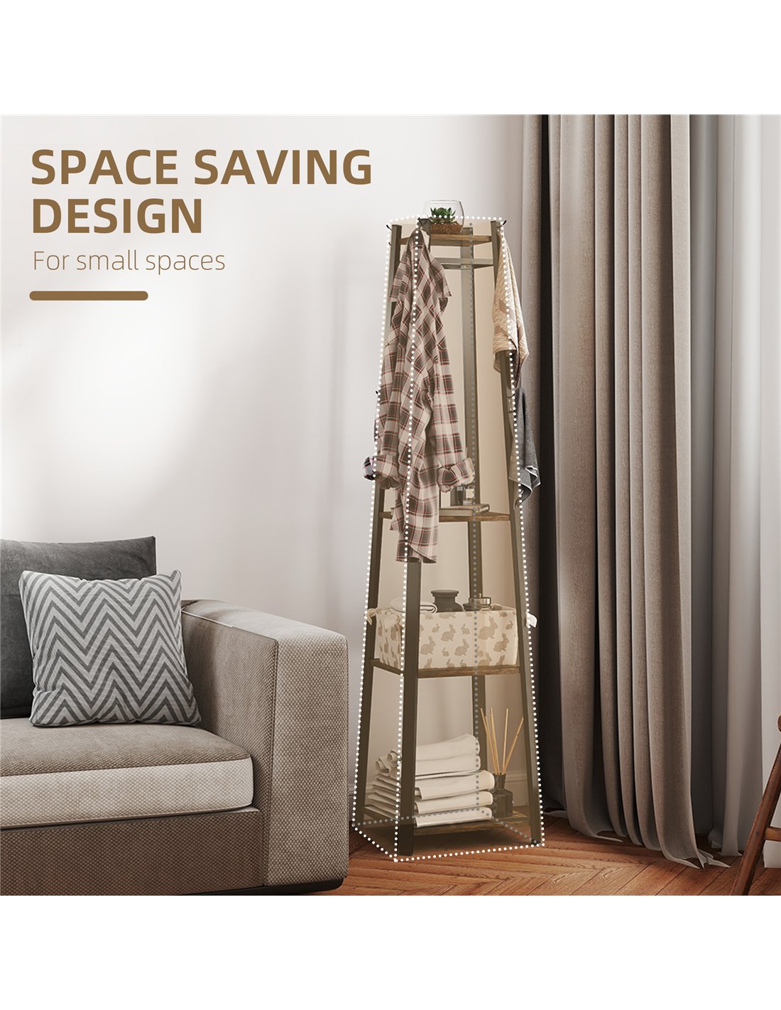 This HOMCOM clothes rack is a multi-feature design: with eight double hooks, three lower shelves and an upper shelf, it offers plenty of room for coats, bags, shoes and other accessories - all in one spot. The trapezium allows it to fit snug into corners, so it's perfect for smaller spaces throughout the home.