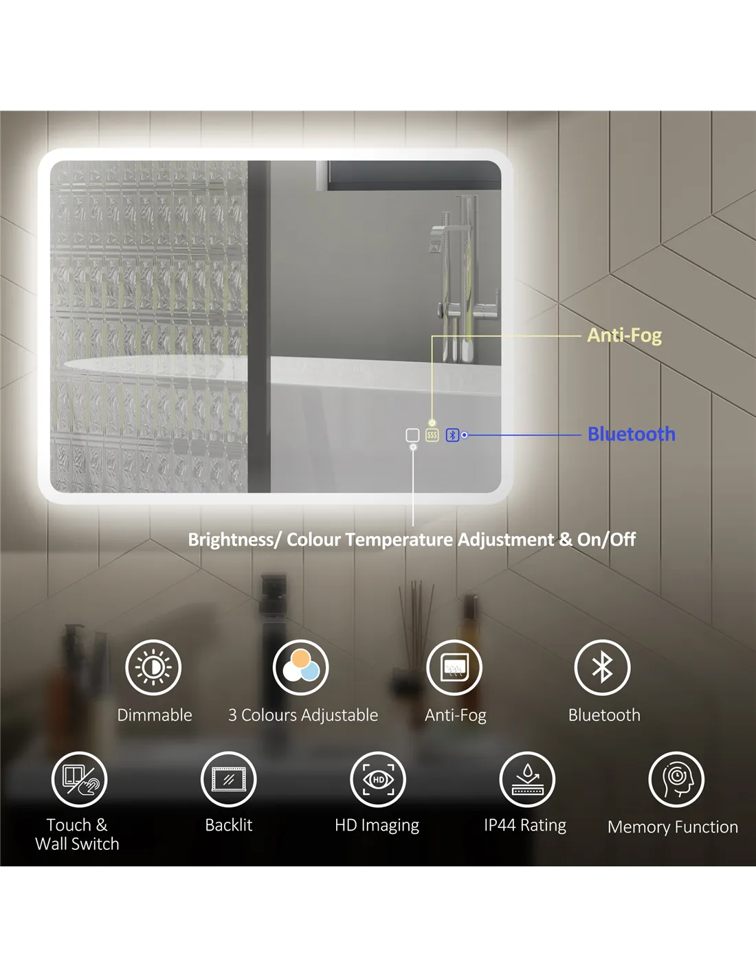 - IP44 rating makes mirror safe in steamy shower bathrooms