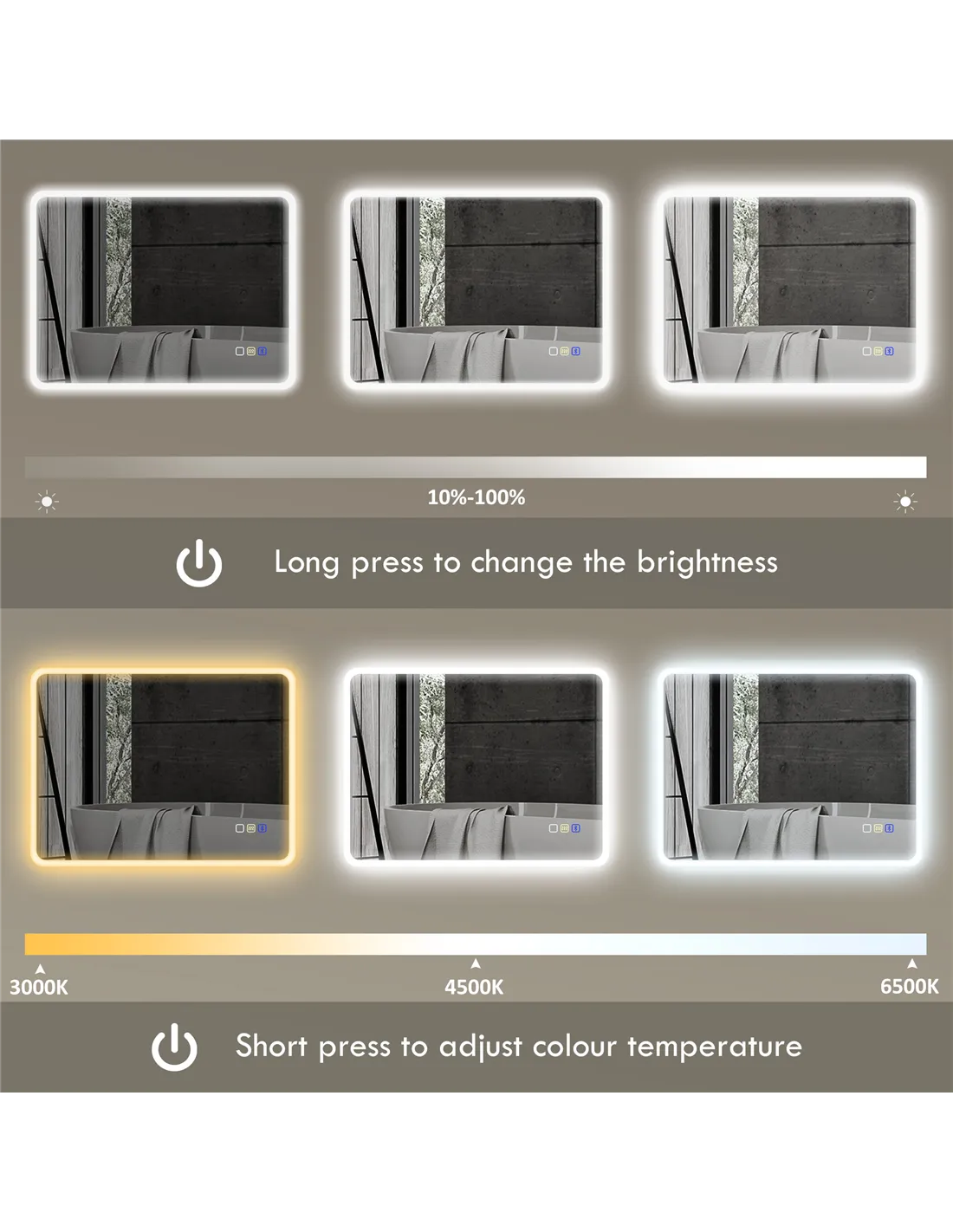 - Outer LED switches between warm light, natural light or cool white. Also adjust brightness between 10-100%