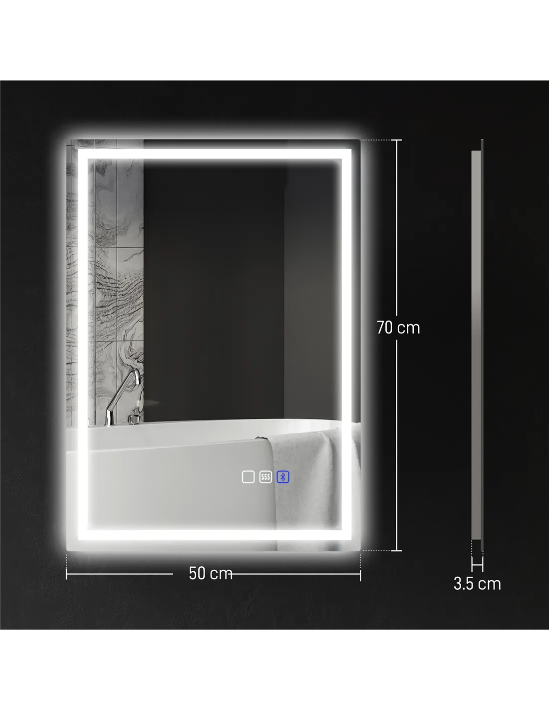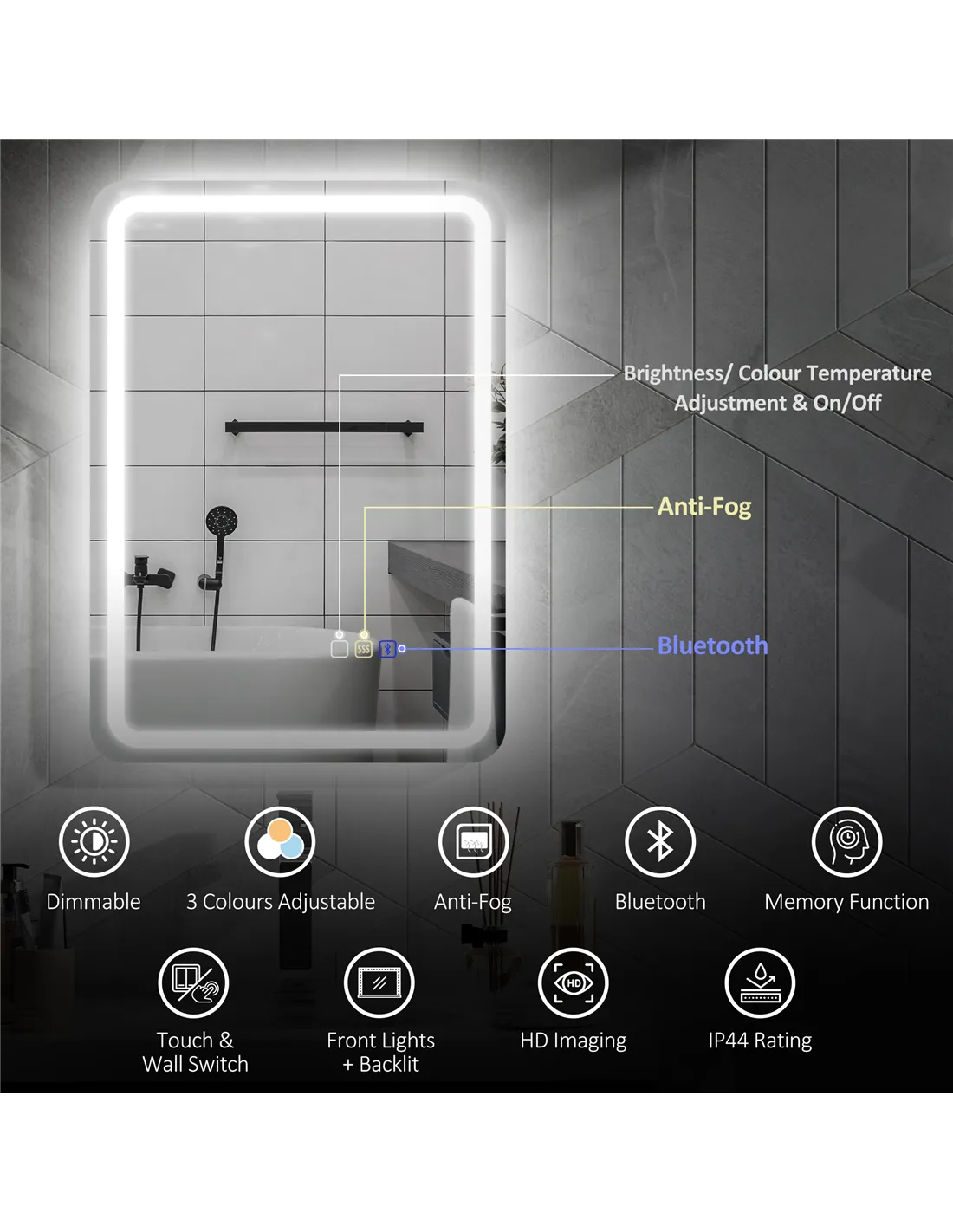 Absolutely. The mirror features three colour settings (warm, natural, cool) with brightness adjustable from 10% to 100% to suit your needs. - Is the Bluetooth speaker waterproof?