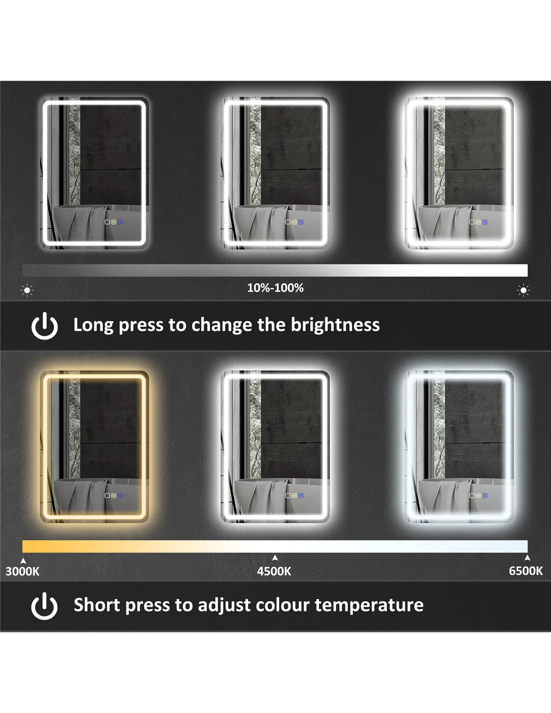 - LED lights change between three colours. 10-100% adjustable brightness. Set mirror to how you need