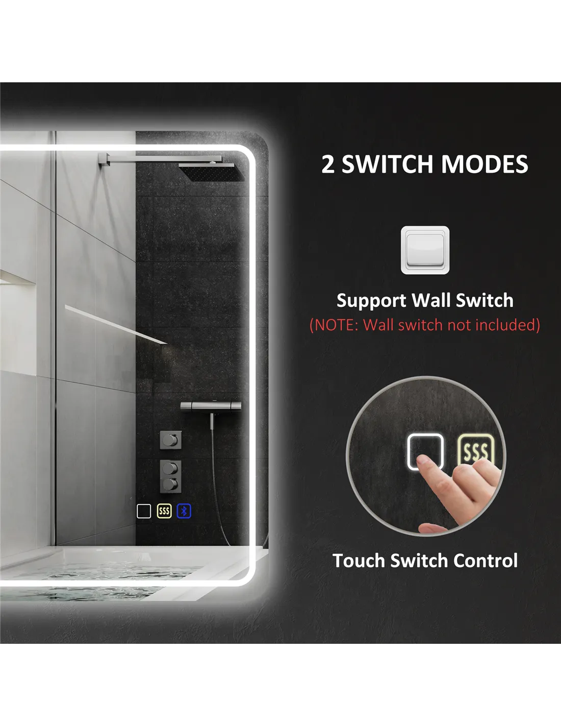 - Support wall and touch switch-mirror requires professional hardwiring. Hang vertically only