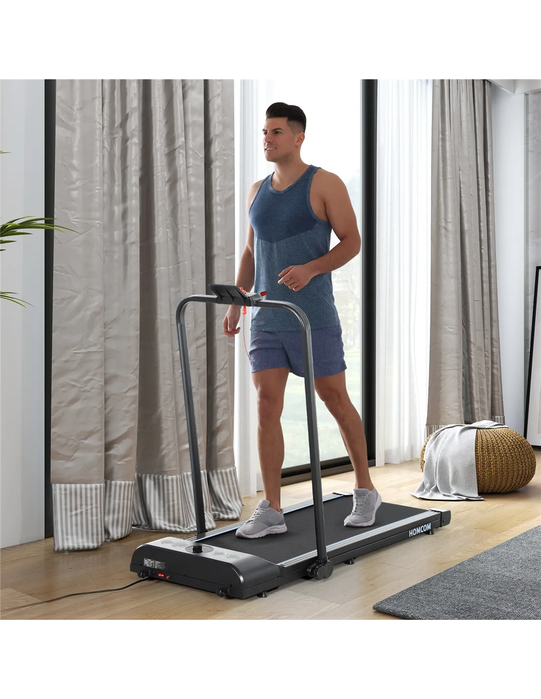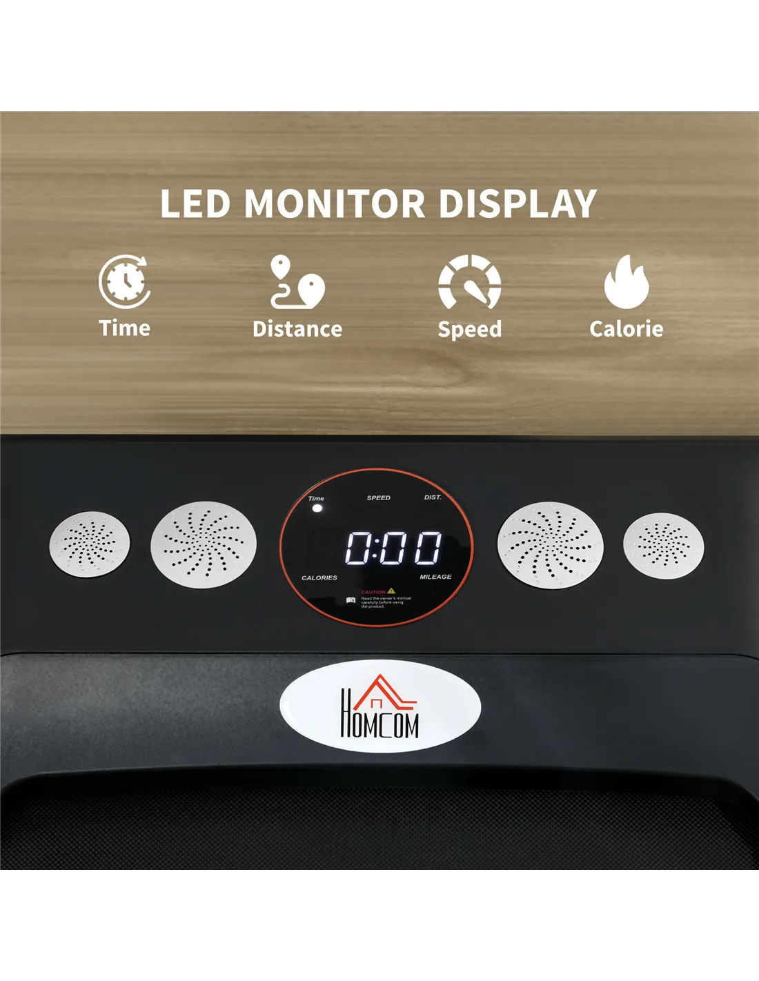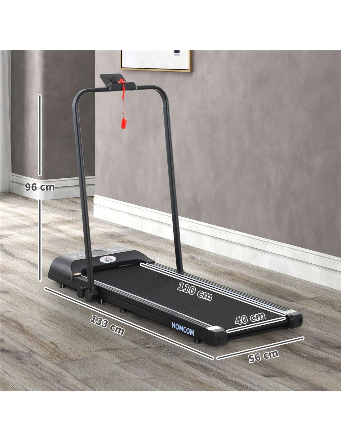 Boost your step count without leaving home with the HOMCOM walking treadmill. The built-in LED screen helps you monitor time, speed, distance and calories, keeping you on track with your fitness goals. It features a non-slip running belt for safety and a safety key that allows for quick stops if necessary. With two wheels at the bottom, it's easily portable, making it convenient to move wherever you need. Enjoy an effective and safe workout right from the comfort of your own home!