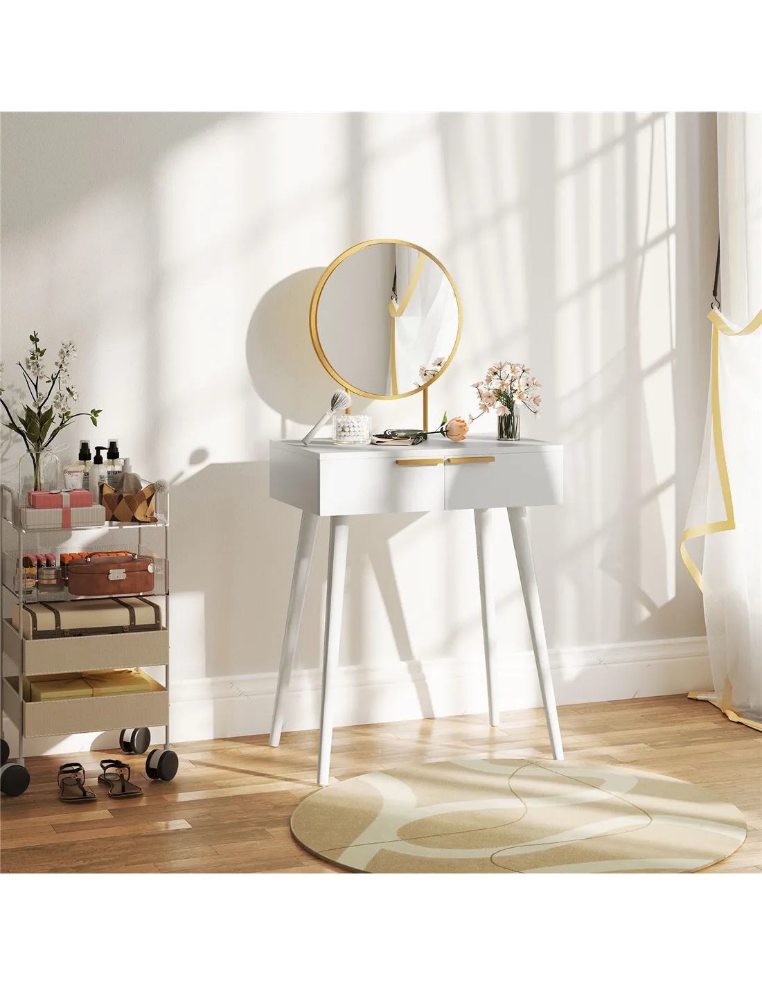 - Use the spacious tabletop to organise cosmetics, skincare products, and jewellery, while the two drawers provide discreet storage for brushes, perfumes, and accessories.