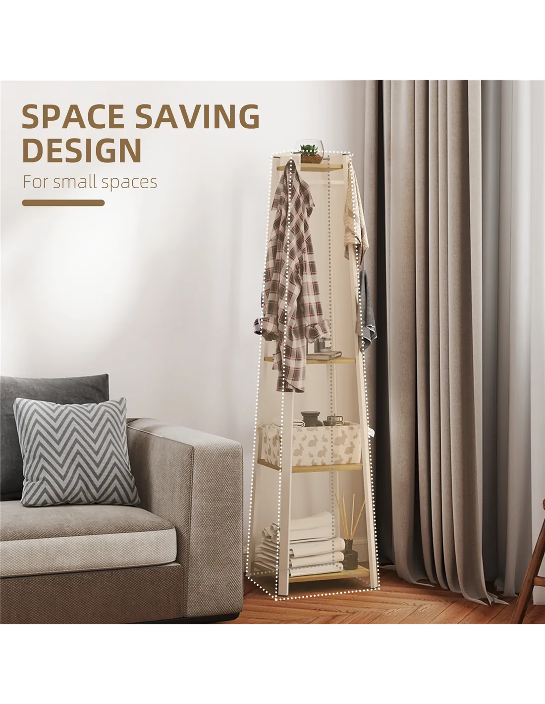 This HOMCOM clothes rack is a multi-feature design: with eight double hooks, three lower shelves and an upper shelf, it offers plenty of room for coats, bags, shoes and other accessories - all in one spot. The trapezium allows it to fit snug into corners, so it's perfect for smaller spaces throughout the home.