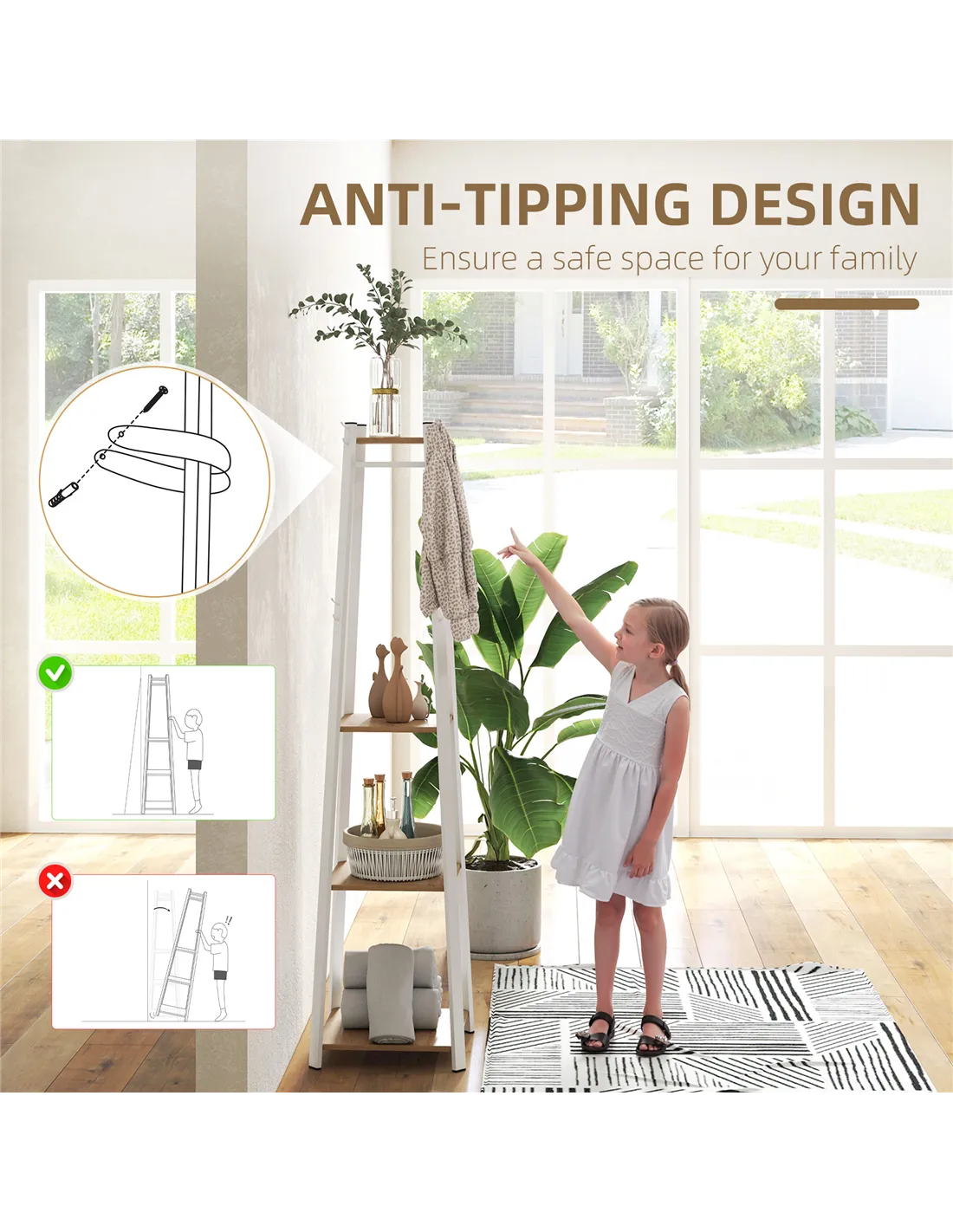 - Anti tipping straps to attach securely to a wall. Adjustable feet for balance