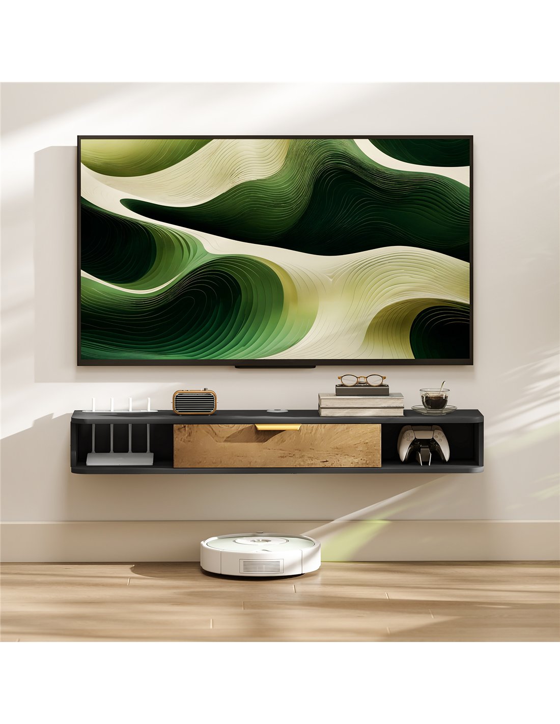 The HOMCOM 120 cm floating TV stand is perfect for modern British homes seeking to optimise space without compromising style. Ideal for living rooms, bedrooms, or compact apartments, this wall-mounted unit frees up floor area, creating a more open and organised environment. Use the two open shelves to display media players, gaming consoles, or decorative items, while the flip-up cabinet conceals remotes, DVDs, or other essentials, keeping your space clutter-free. The integrated cable management system ensures wires remain hidden, maintaining a sleek and tidy appearance. Its charcoal grey and natural wood finish complements a variety of interior styles, from contemporary to Scandinavian-inspired décor.