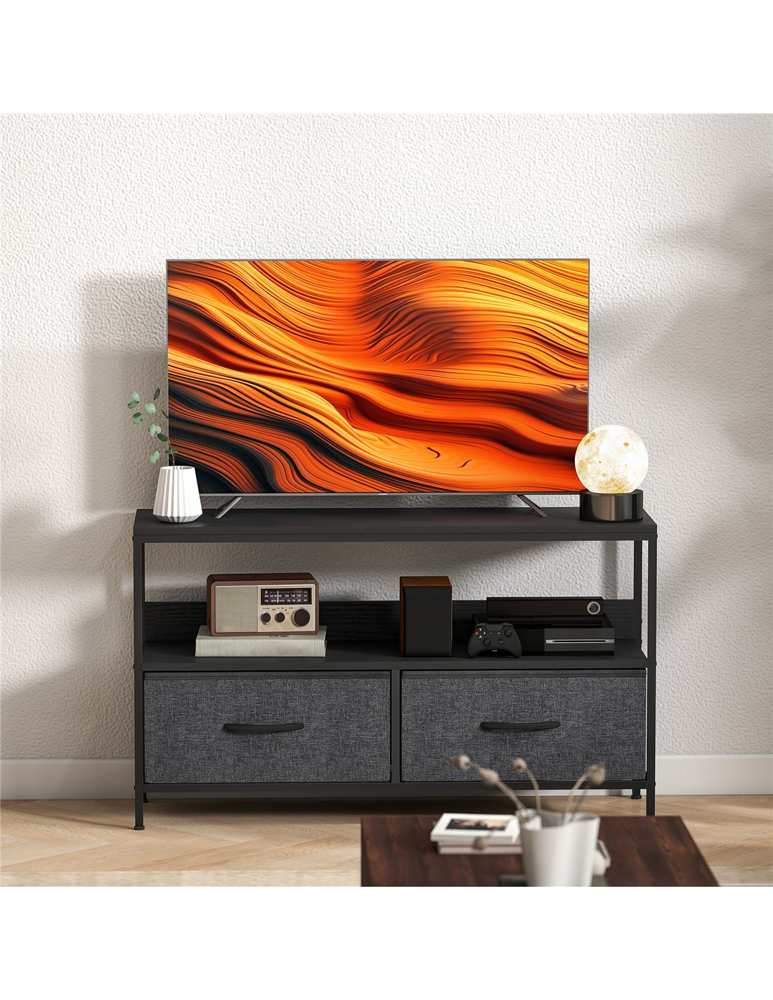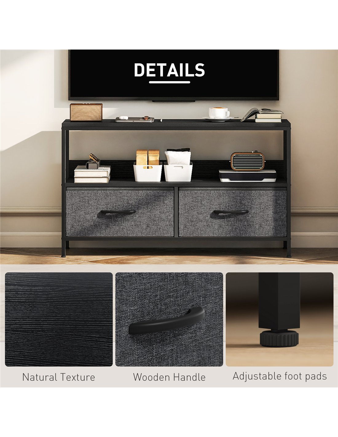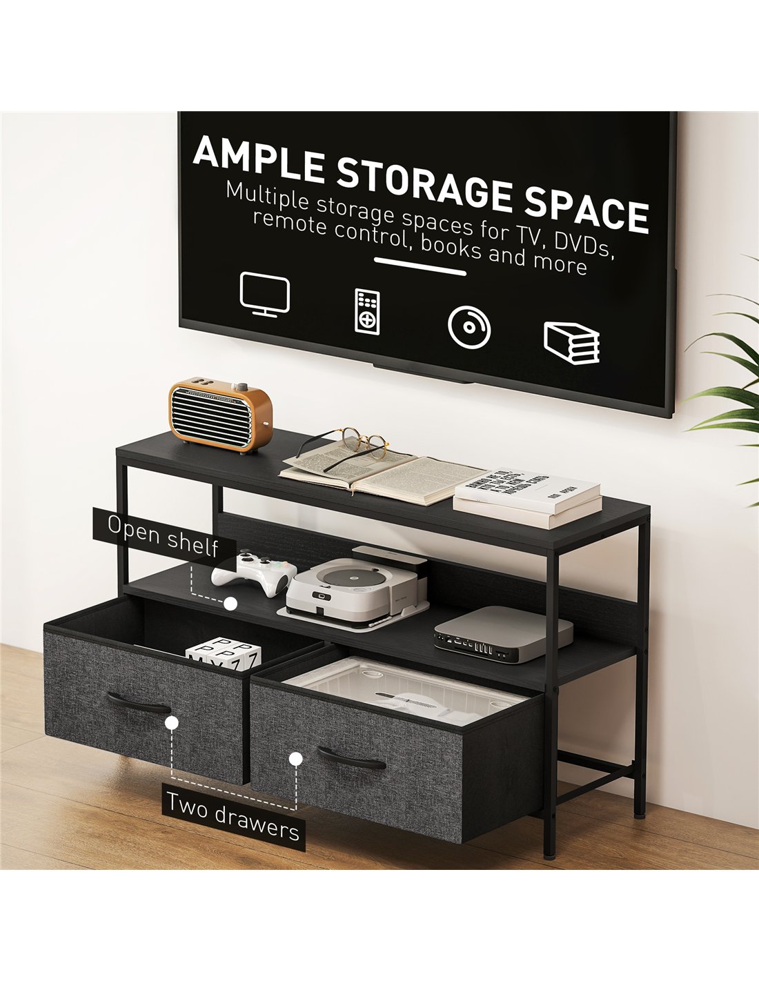 The HOMCOM TV Stand Cabinet with 2 Foldable Drawers in black is a versatile addition to any British home. Ideal for living rooms, bedrooms, or entertainment areas, it supports TVs up to 47 inches, making it perfect for compact flats or spacious lounges alike. The foldable drawers offer flexible storage for media accessories, gaming controllers, or magazines, while the open shelf provides easy access to remotes and DVDs. Thanks to its dual-colour design and sturdy steel frame, this unit complements modern and minimalist interiors, adding both style and practicality. Adjustable feet ensure stability on uneven floors, protecting your surfaces from scratches.