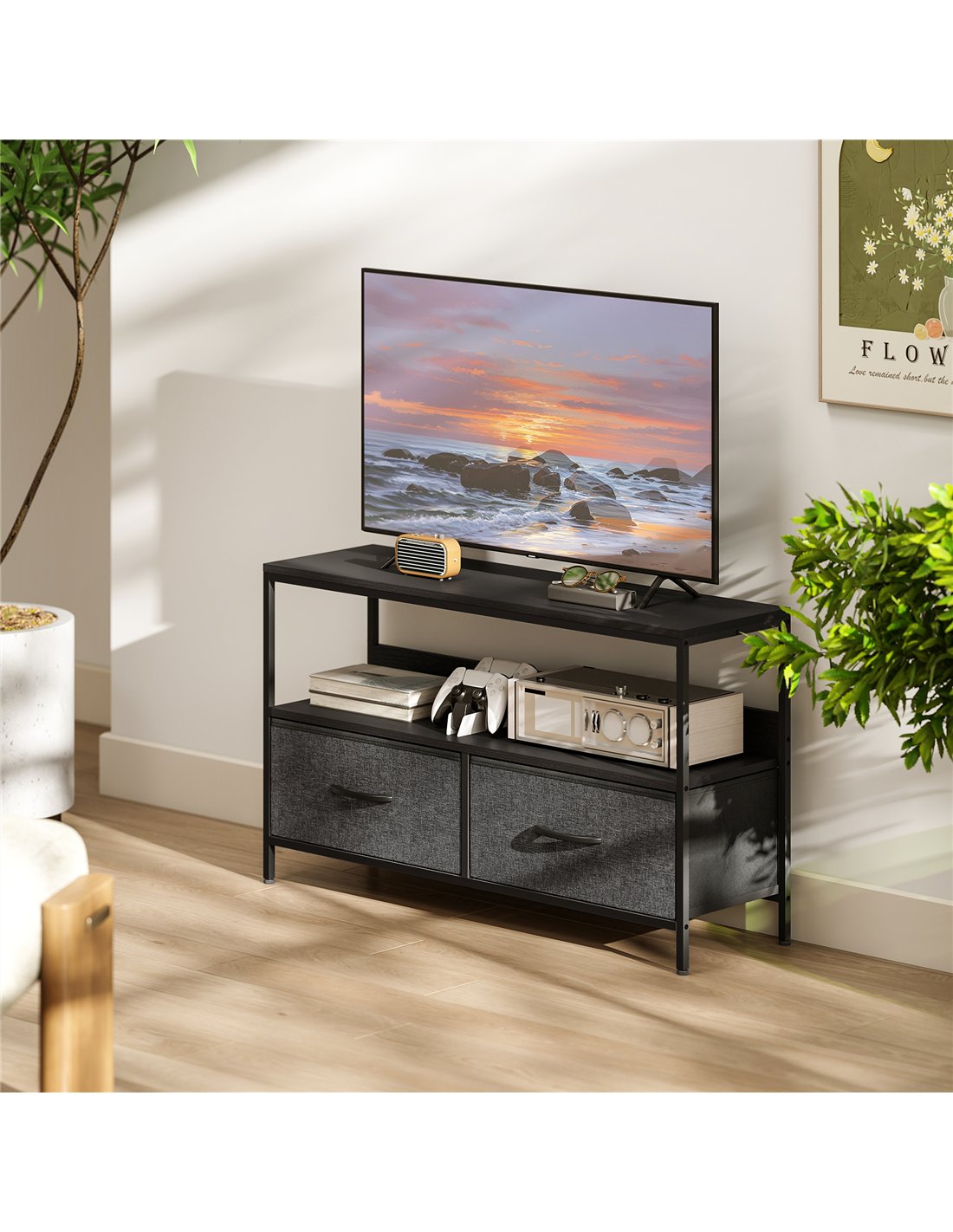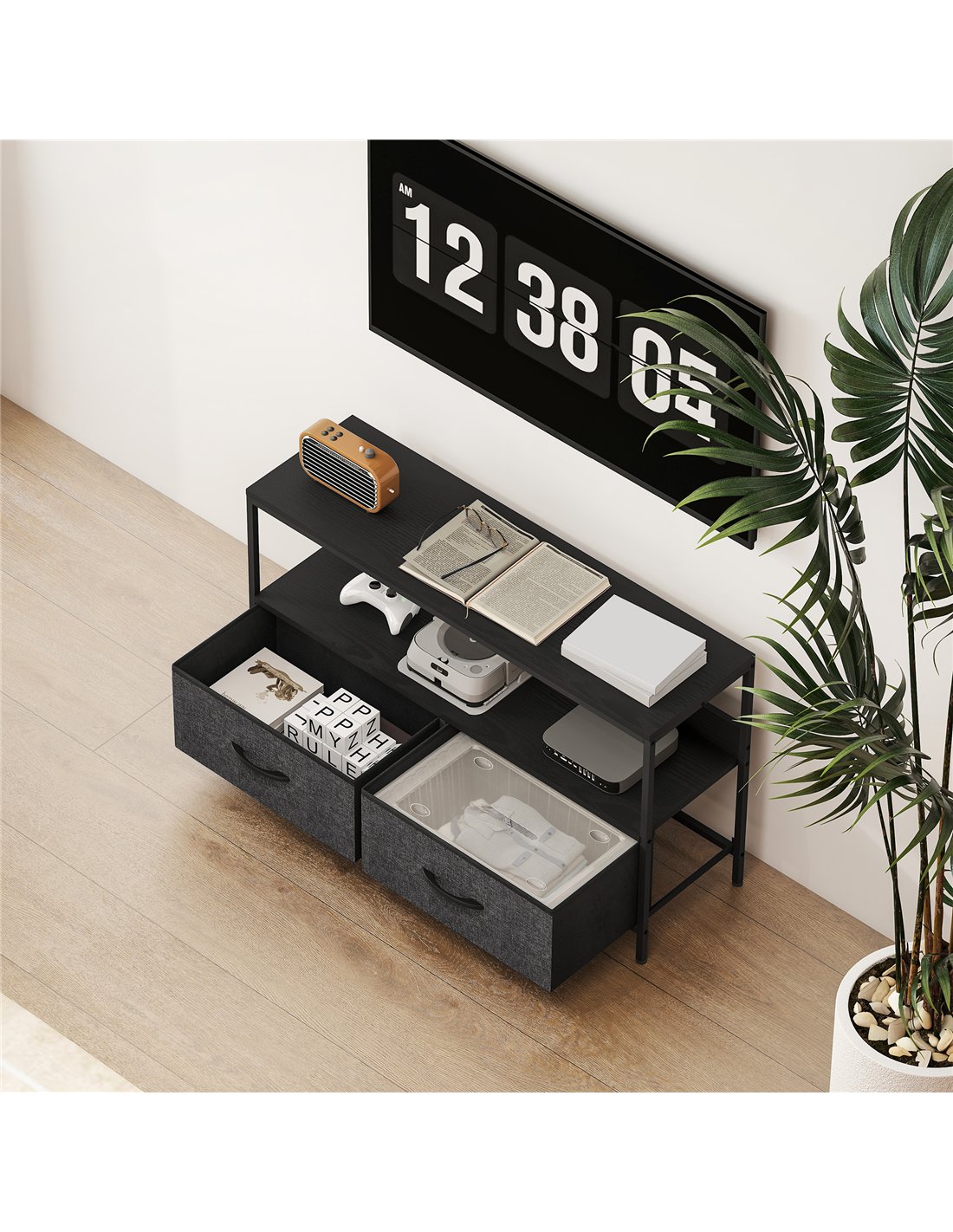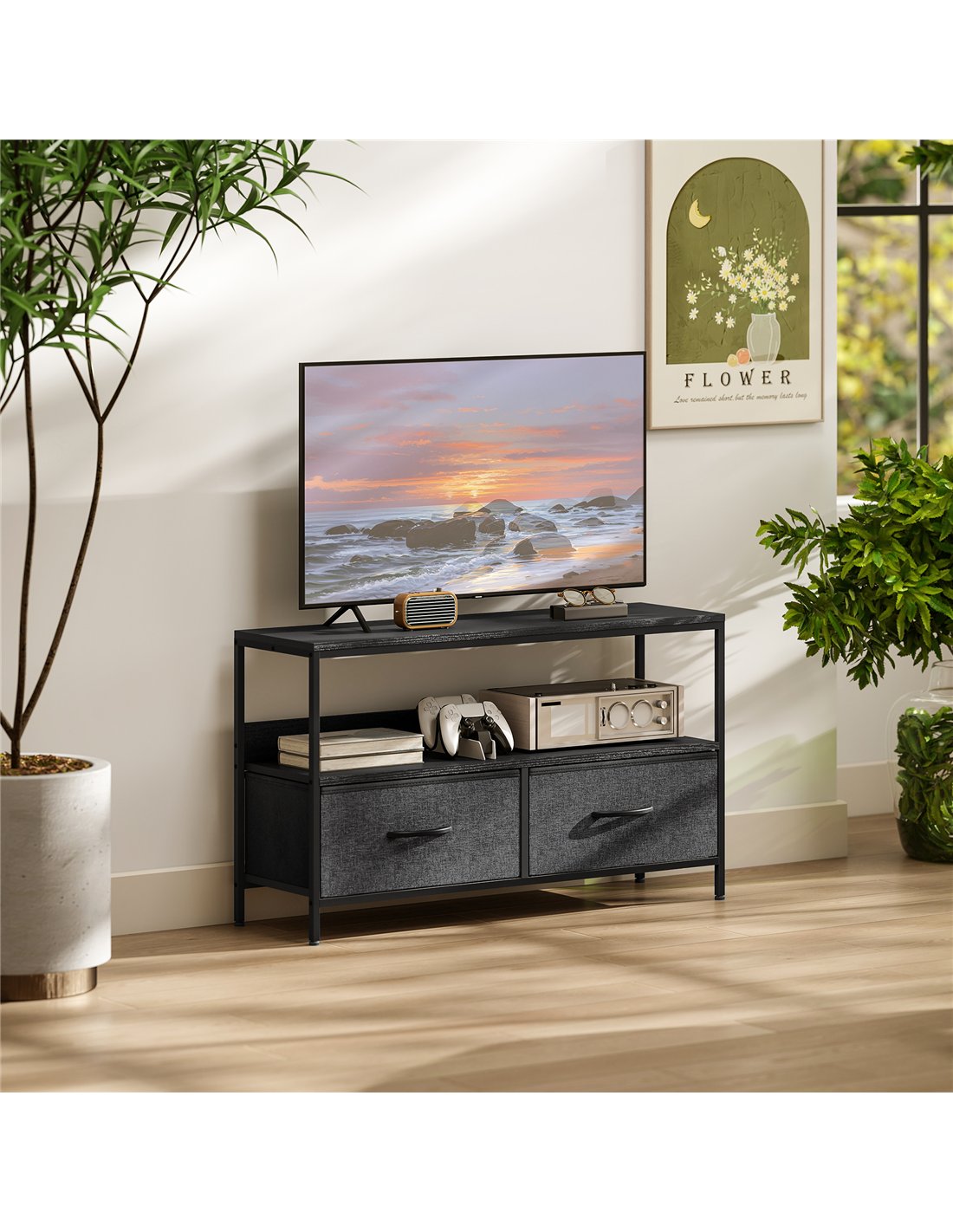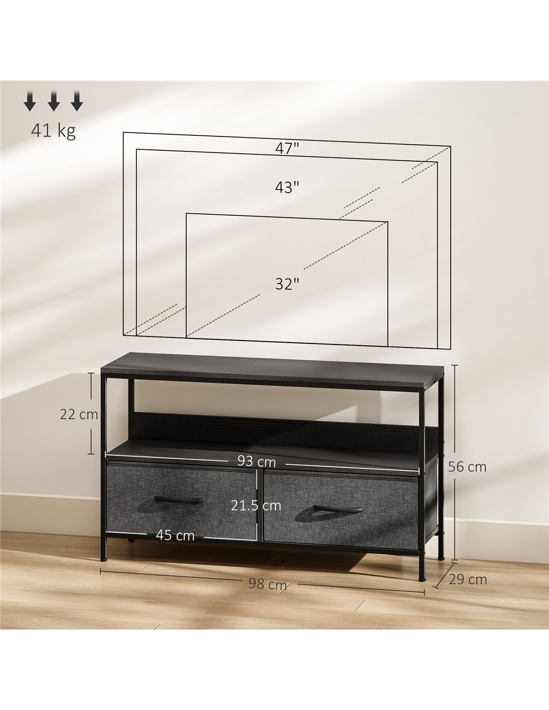 The HOMCOM TV Stand Cabinet with 2 Foldable Drawers in black is a versatile addition to any British home. Ideal for living rooms, bedrooms, or entertainment areas, it supports TVs up to 47 inches, making it perfect for compact flats or spacious lounges alike. The foldable drawers offer flexible storage for media accessories, gaming controllers, or magazines, while the open shelf provides easy access to remotes and DVDs. Thanks to its dual-colour design and sturdy steel frame, this unit complements modern and minimalist interiors, adding both style and practicality. Adjustable feet ensure stability on uneven floors, protecting your surfaces from scratches.