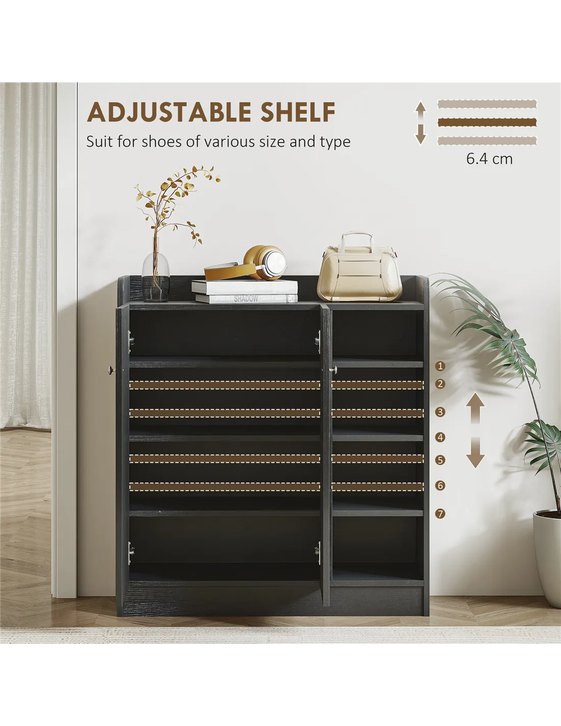 The HOMCOM shoe storage cabinet is a versatile addition to any British home, ideal for organising footwear in hallways, entryways, or bedrooms. Its adjustable shelves accommodate various shoe sizes, making it perfect for families with diverse footwear needs. The sleek black finish and aluminium handles complement modern and traditional interiors alike, while the top surface provides extra space for keys, mail, or decorative items. Use it in compact flats to maximise storage without sacrificing style, or in offices to keep staff shoes neatly arranged. Thanks to its anti-tilt design, it offers safe and stable storage, even in busy households.