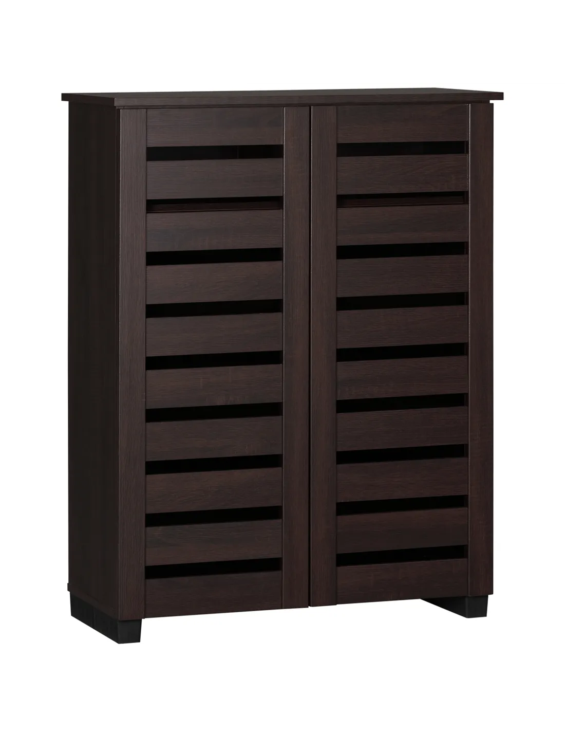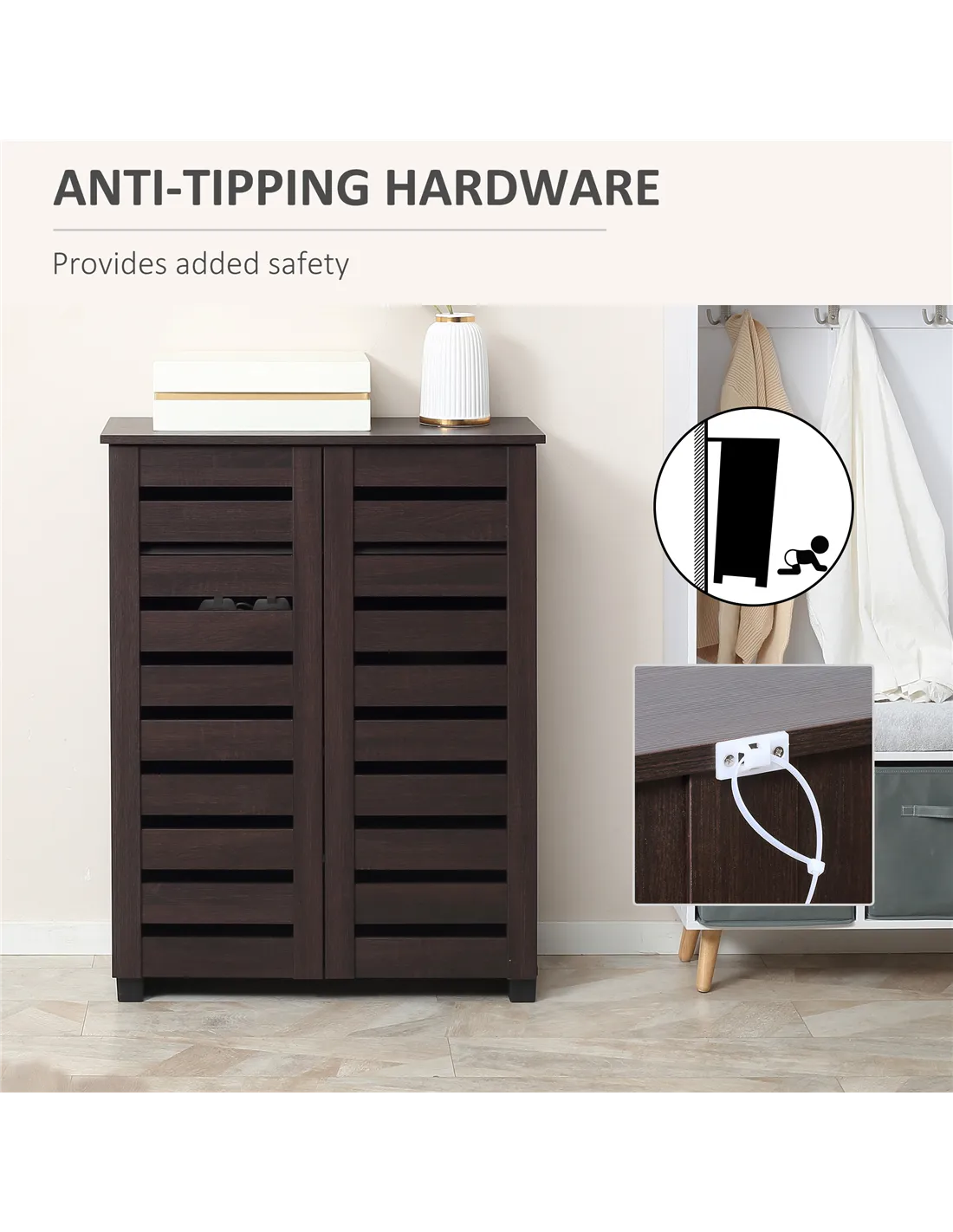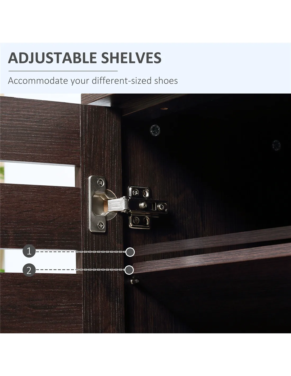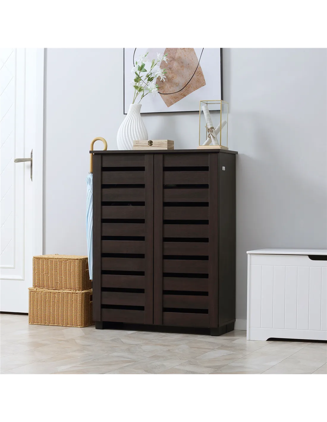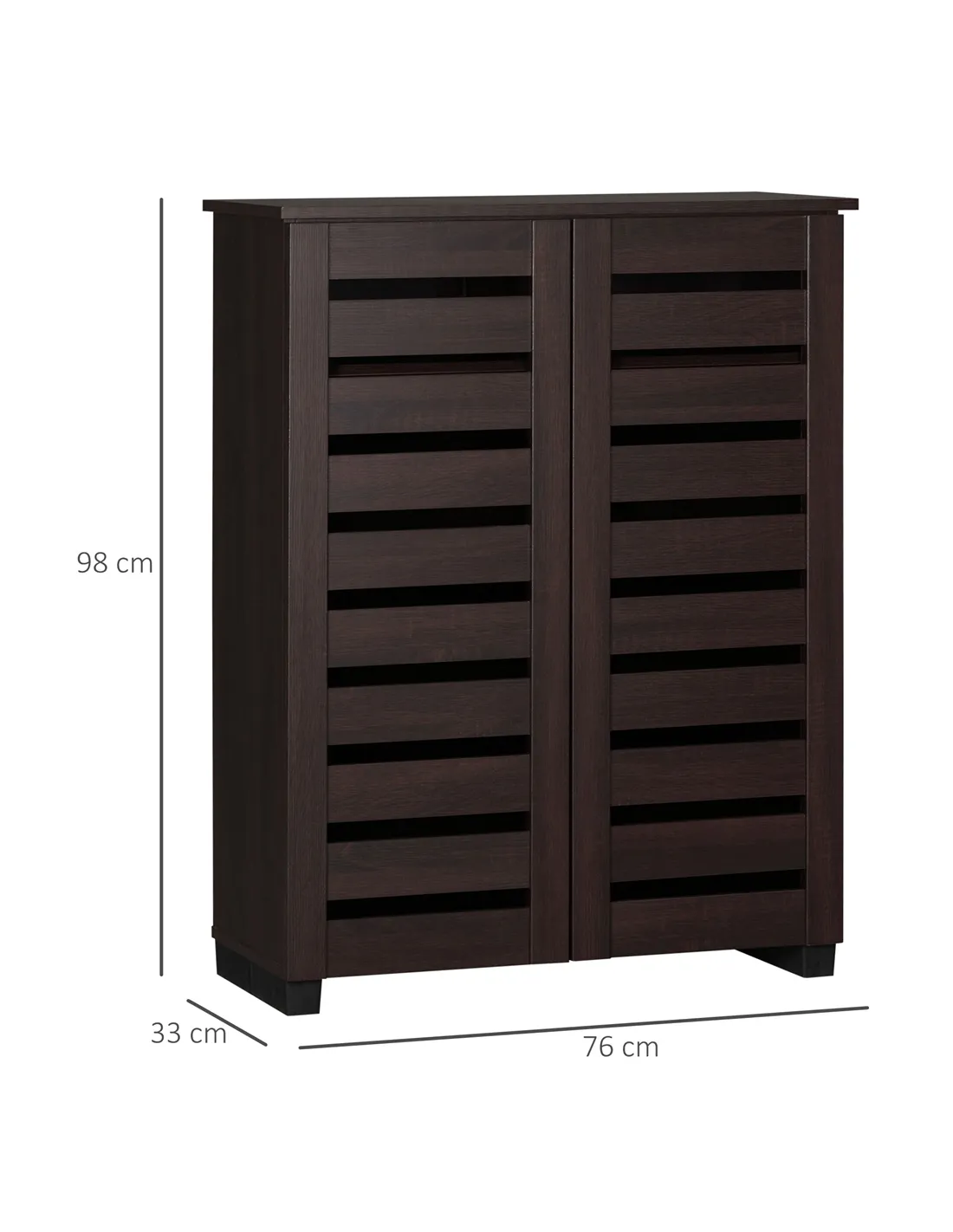 Organise and store footwear in classic, beautiful style, with this HOMCOM shoe storage unit. It has five tiers, with four adjustable shelves, providing space for 15 shoe pairs - great for individual and shared use. This slim shoe cabinet comes complete with two slatted doors to bring inside ventilation.