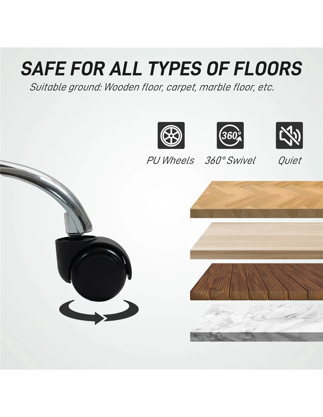 - 360° swivel seat and PU wheels allow easy movement on various flooring types