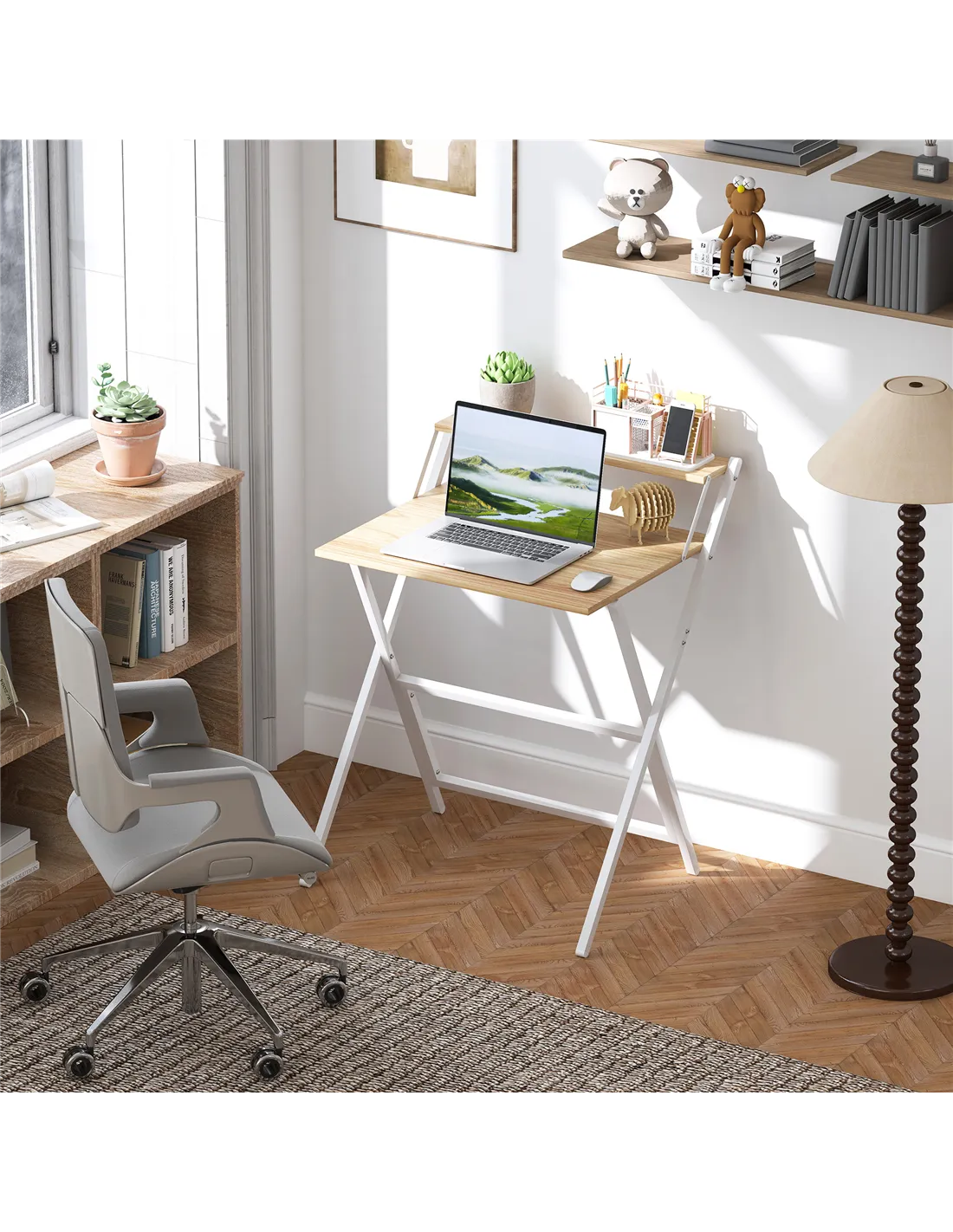 The HOMCOM 70 cm folding desk is ideal for maximising space in compact living environments across the UK. Perfect for home offices, student bedrooms, or shared flats, it transforms small corners into efficient workstations. Use the elevated shelf to position your monitor at eye level, reducing neck strain, or store stationery and books neatly. When not in use, fold the desk flat to tuck it away behind a door or under a bed, keeping your room clutter-free. Its natural wood finish complements a variety of interior styles, from modern minimalist to cosy traditional settings.