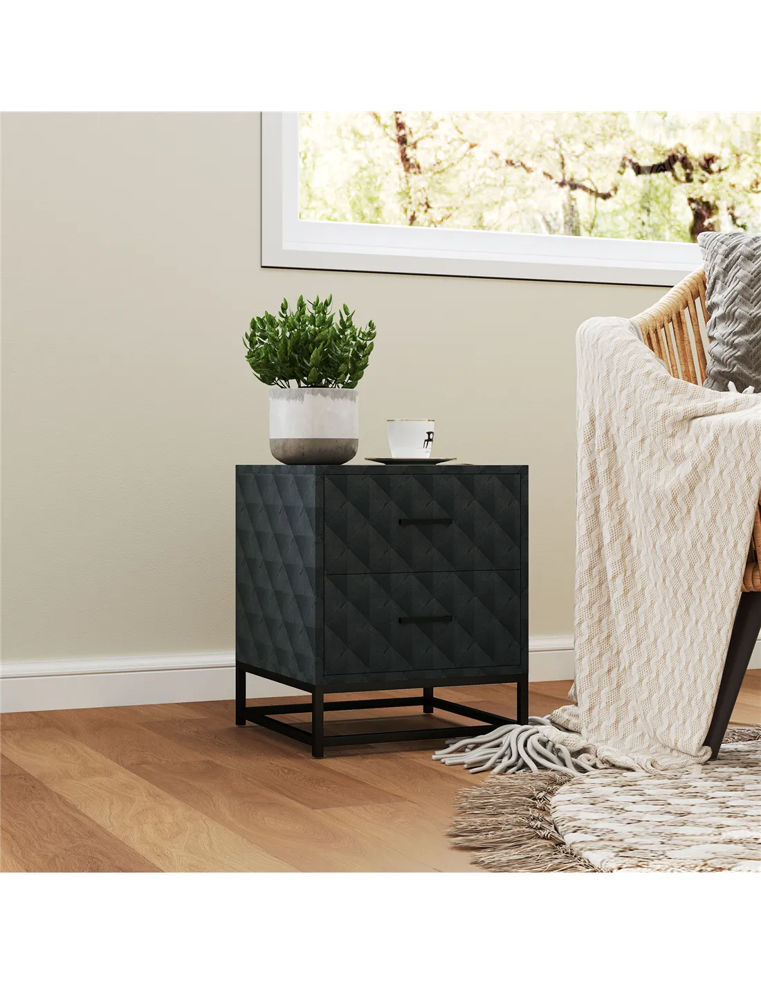Add a splash of modern minimalism to your bedroom with the HOMCOM small bedside table set. Featuring a chic diamond-patterned veneer atop a sleek black steel frame, these bedroom drawers combine style with functionality. Each end table includes two drawers on smooth alloy rails, providing optimal storage while balancing your bedroom décor effortlessly. This pair fits any contemporary space and is suitable as a small side table or bedside table.