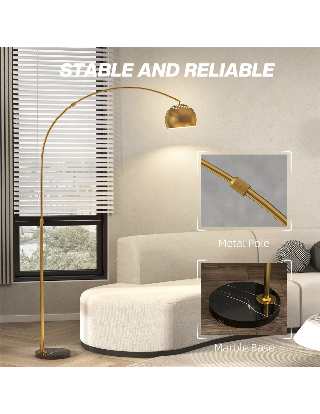 Add a touch of glamour to your home with this retro-designed arch floor lamp from HOMCOM. Its unique design not only brightens any room but also casts a warm glow in dark corners, great for reading, knitting, or working. The metal arch construction offers great stability and a robust base, making this living room lamp a distinctive addition to your decor.