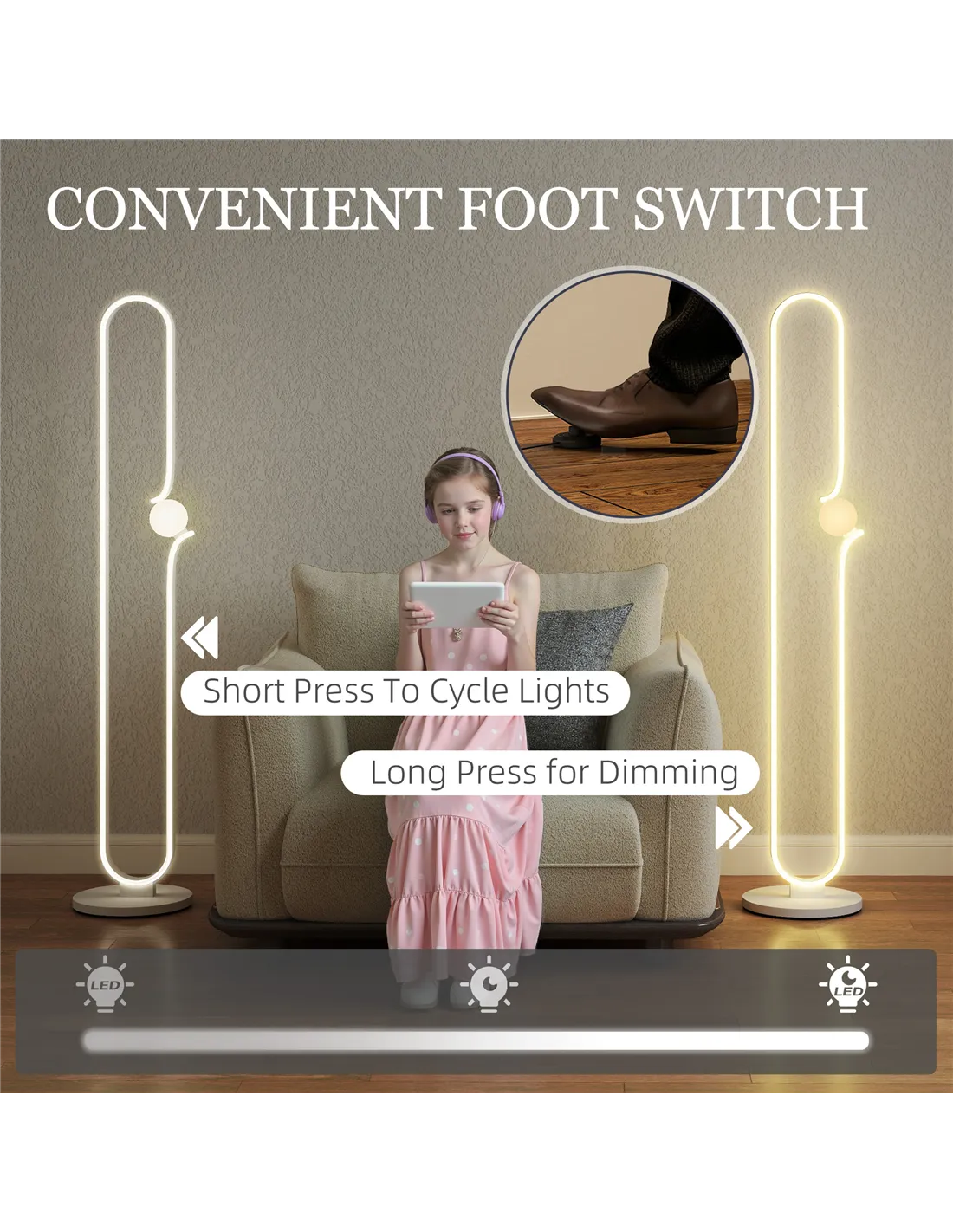 - Short press the foot switch to cycle through night light and LED strip modes, or both
