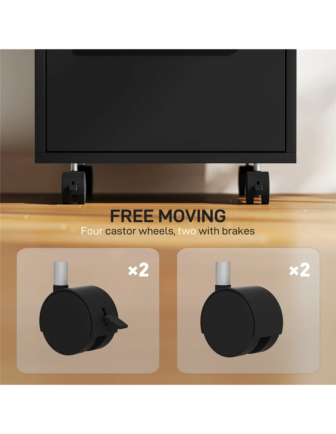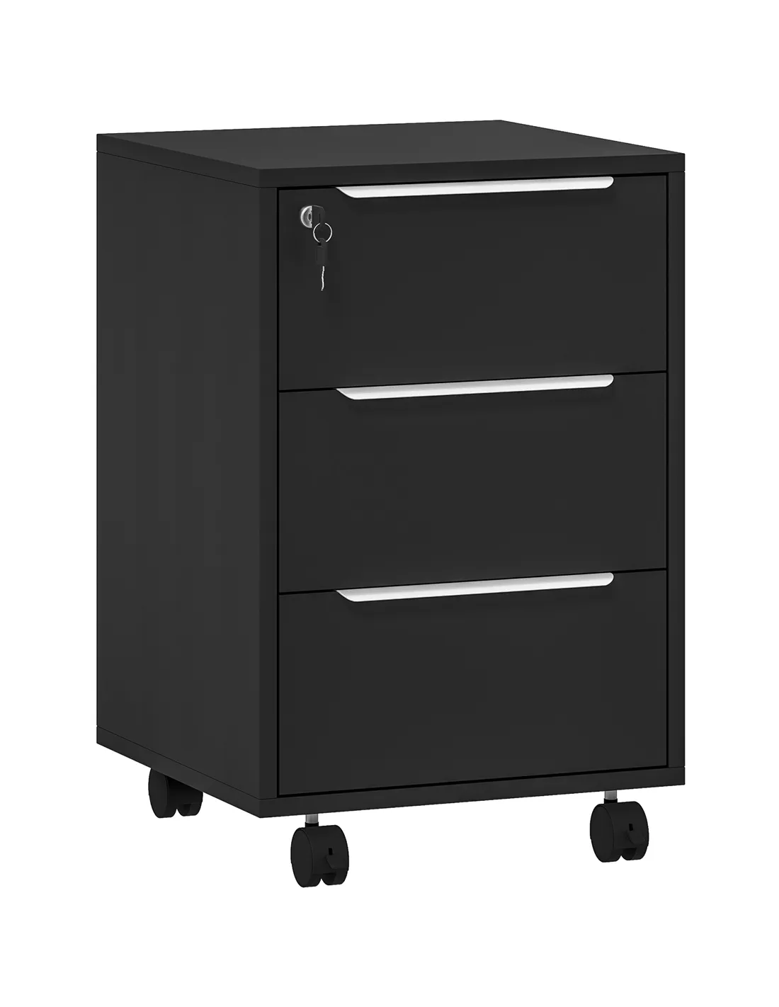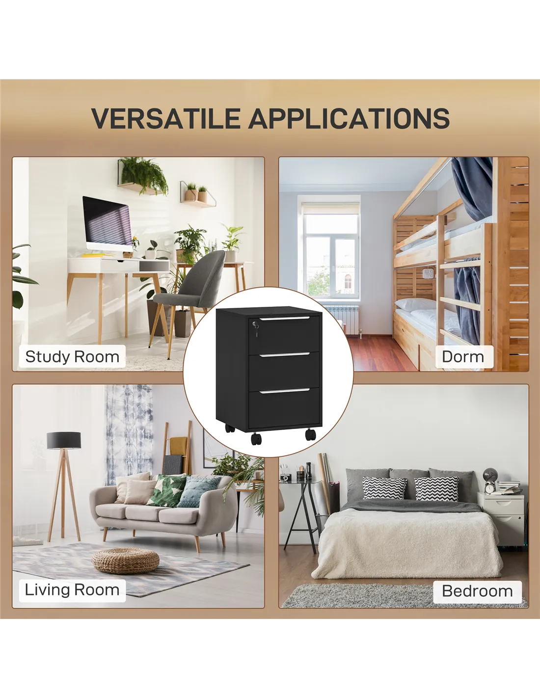 The HOMCOM three-drawer locking filing cabinet in black is a versatile storage solution ideal for various rooms in your home. Perfect for organising important documents, stationery, and office supplies, it fits seamlessly in a home office, study, bedroom, or even the living room. Thanks to its compact dimensions and smooth-rolling wheels, it can be easily moved to suit your workspace needs. The secure central locking system ensures sensitive paperwork remains protected, making it suitable for freelancers, remote workers, or anyone needing reliable document storage. Its sturdy particle board and MDF construction provide a durable base for everyday use, while the drawers accommodate letter-sized papers laid flat, ideal for keeping bills, receipts, or personal files neatly arranged.
