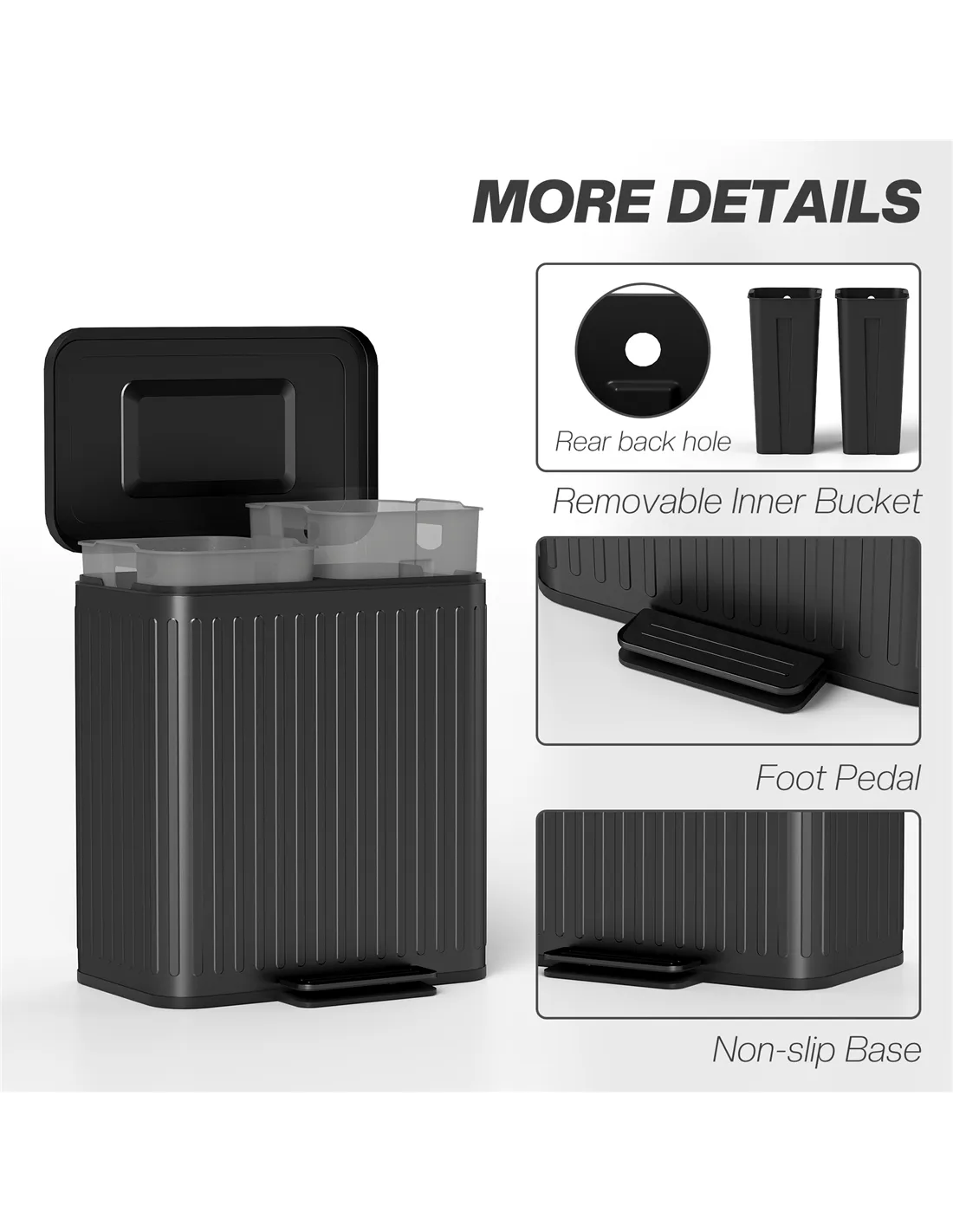- Removable inner buckets, with a hole to fix bin bag for easy cleaning