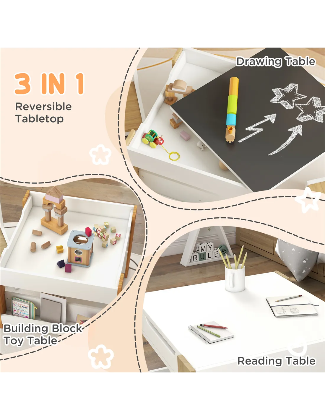 - Tabletop flips over, offering a surface for reading/doing homework and a drawing blackboard