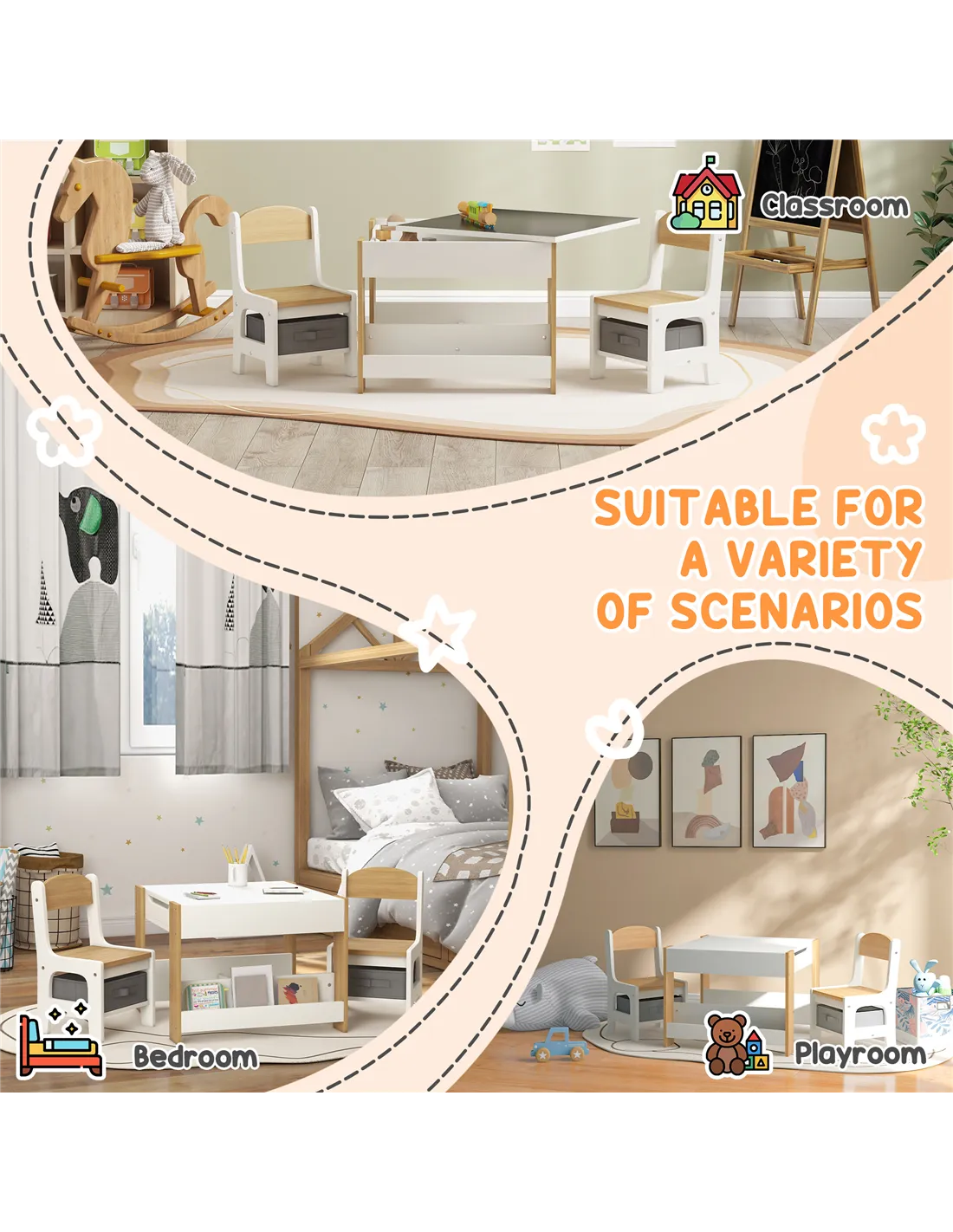- Includes two chairs and a table, suitbable for young children's spaces