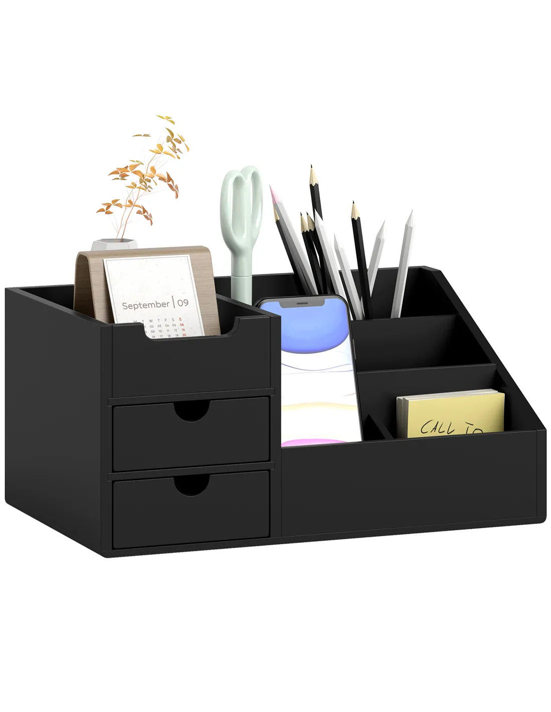 HOMCOM Desk Organiser Holder, Bamboo Multi-Function Storage Caddy with 7 Storage Compartments and 2 Drawers for Home Office Stationary Supplies, Black