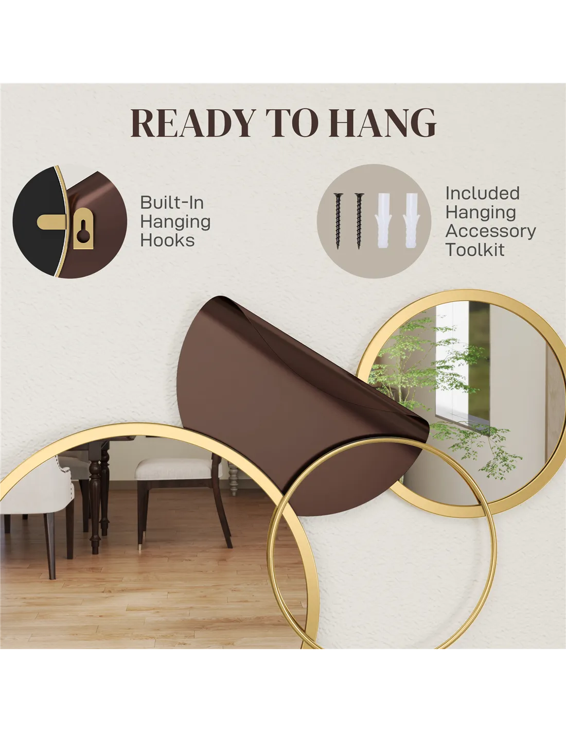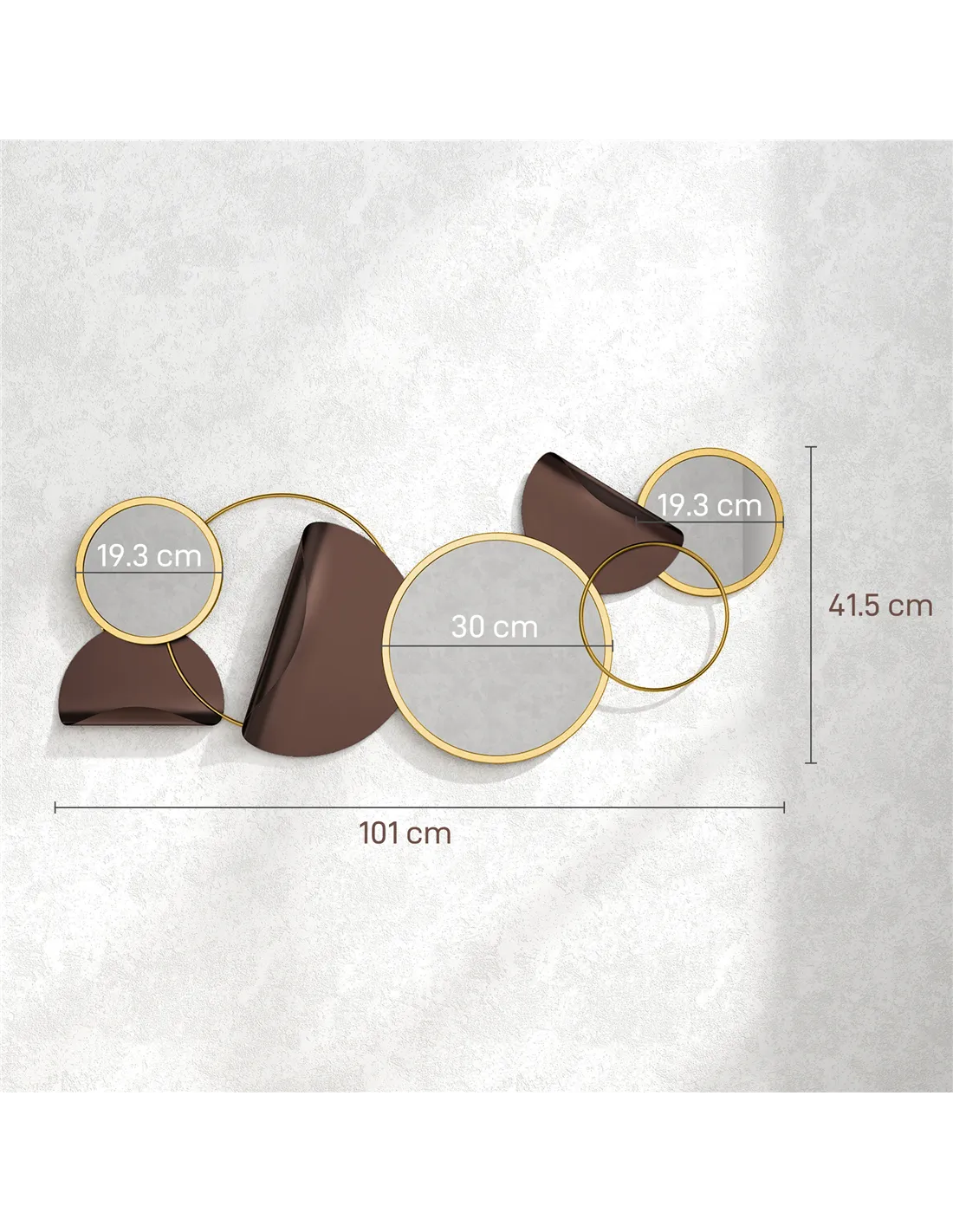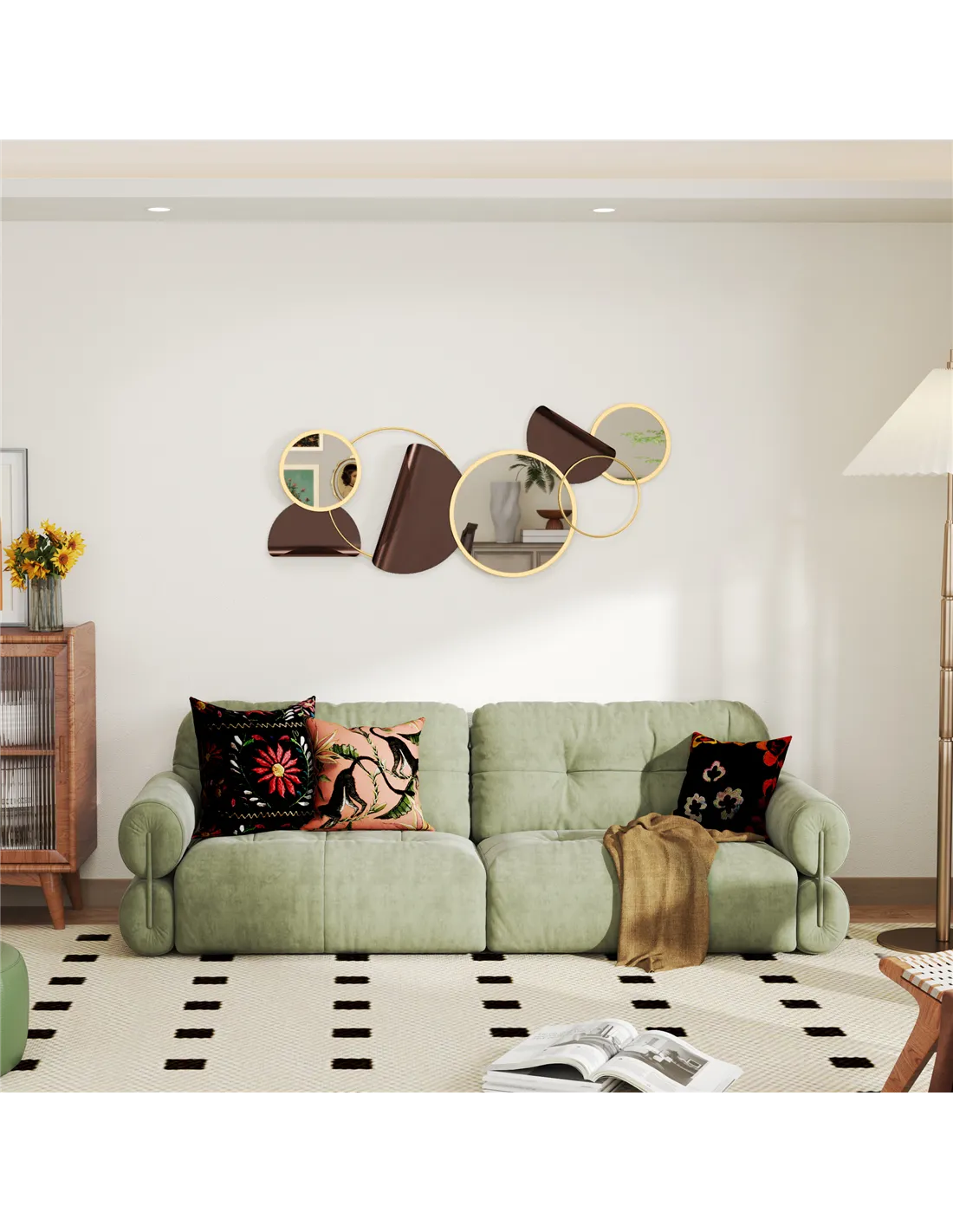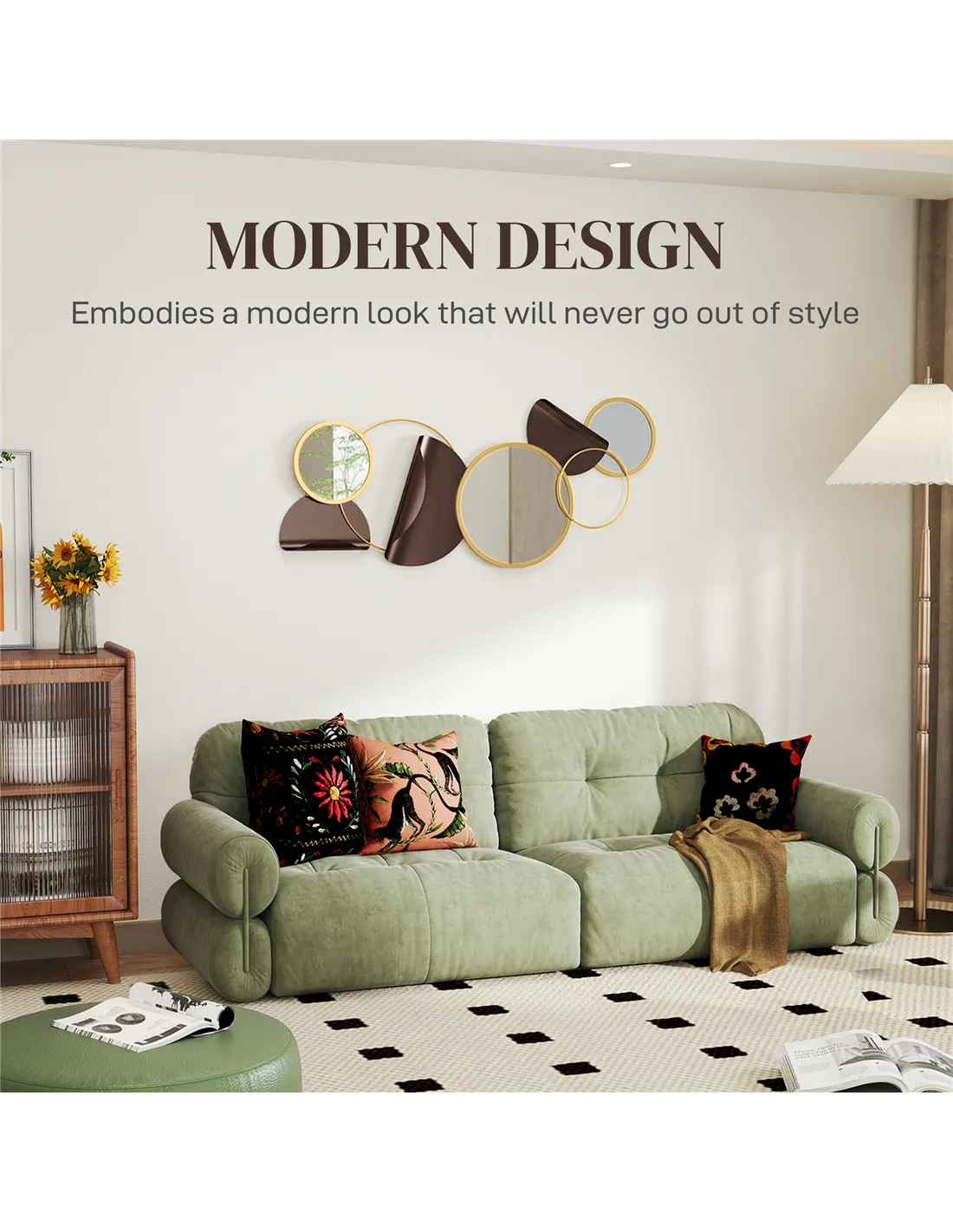 - Circles, round mirrors, 3D bent metal enhance room aesthetics