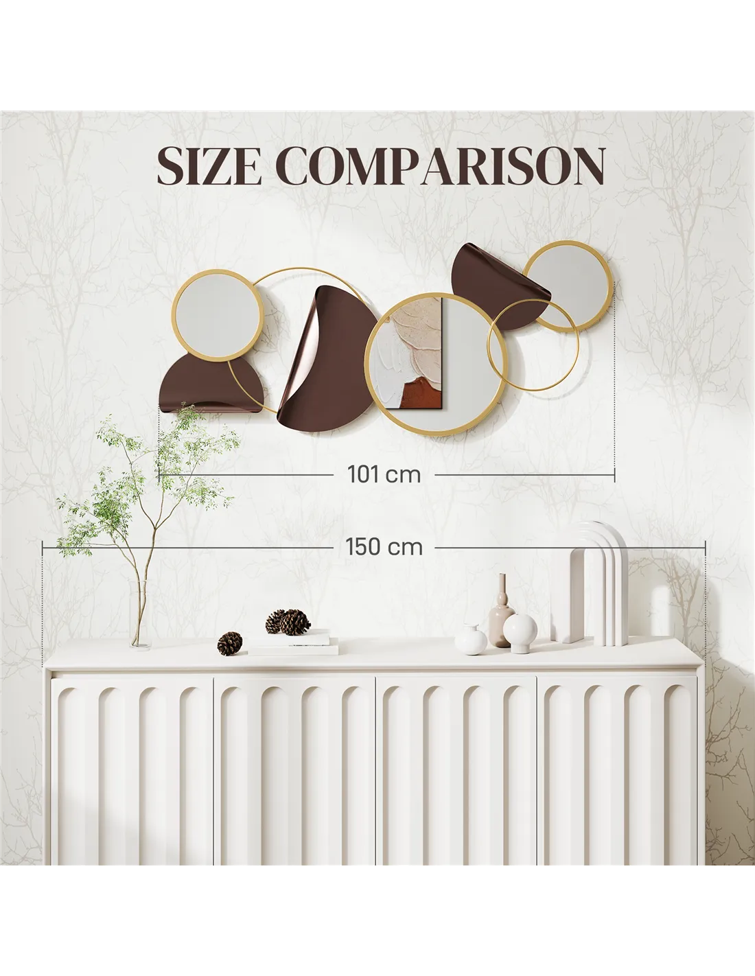 Enhance your home interiors with this striking metal wall art from Homcom, a trusted name in indoor furnishings across the UK since 2012. Ideal for living rooms, bedrooms, dining areas, or hallways, its gold-tone finish and reflective round mirrors create a sense of depth and light, making smaller spaces feel more open. Consider placing it above a sofa or sideboard to add a modern artistic touch, or use it in bathrooms to brighten the area with its elegant 3D metalwork. Thanks to its versatile design, it also complements contemporary and classic décor styles alike, serving as a focal point or a subtle accent.