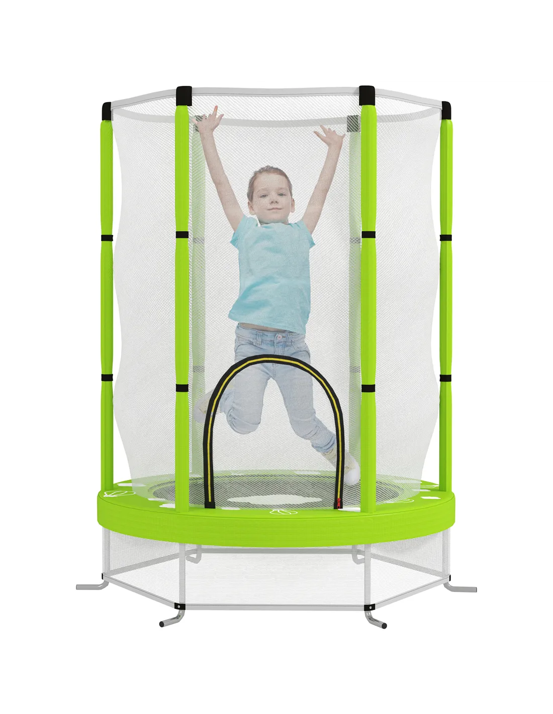 The trampoline supports a maximum load of 45kg, making it ideal for toddlers aged 3 to 6 years. - How does the safety enclosure net protect my child?