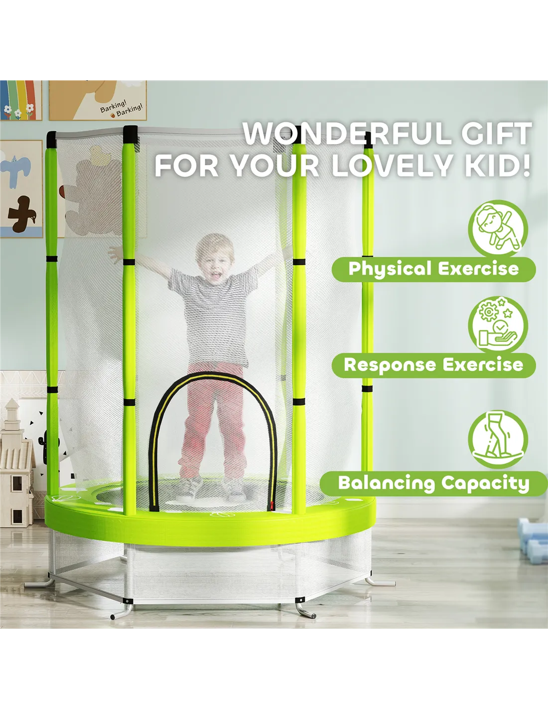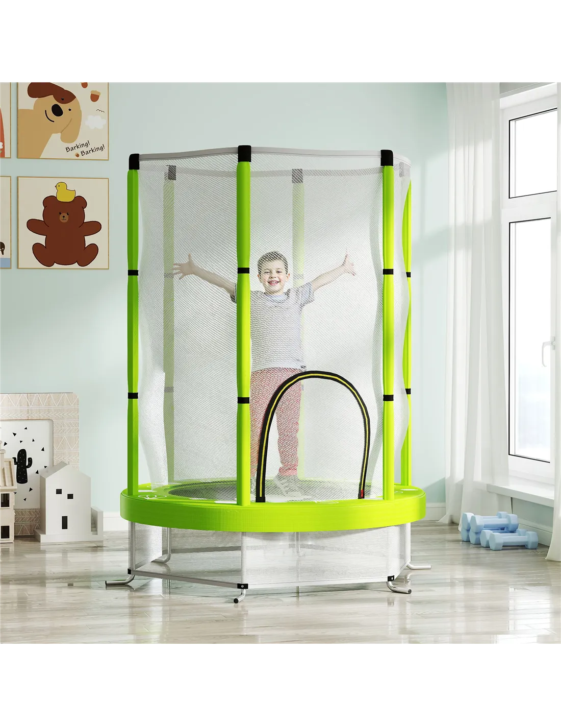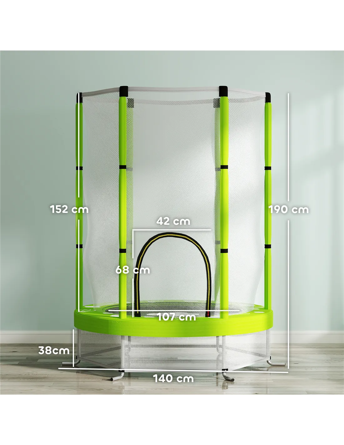 Jump for joy with the AIYAPLAY kids trampoline, designed with six foam-covered poles to protect your floors. It features a spacious jumping area, surrounded by a safety net for fun and secure play. The wear-resistant jump pad with 30 elastic ropes provides extra bounce. Great for indoor and outdoor use, you can set it up anywhere and let the jumping fun begin!