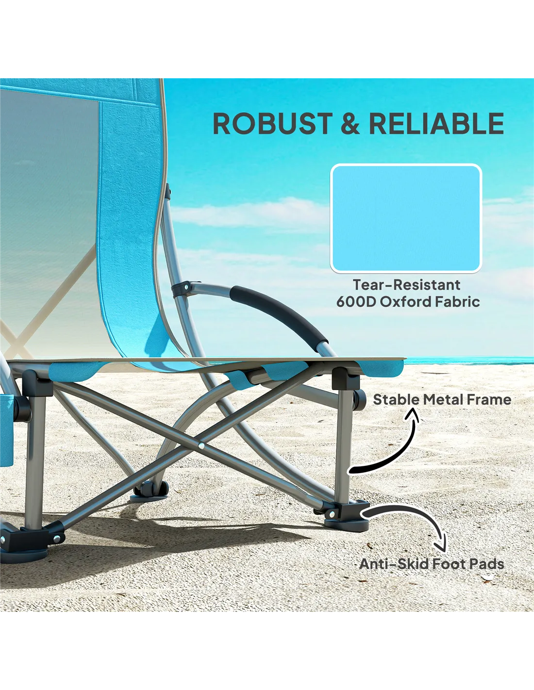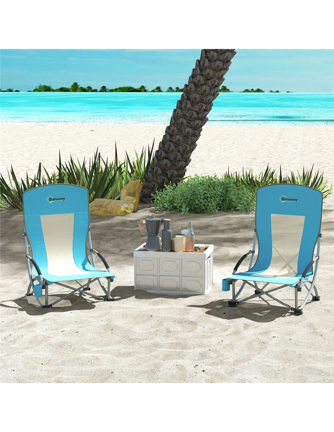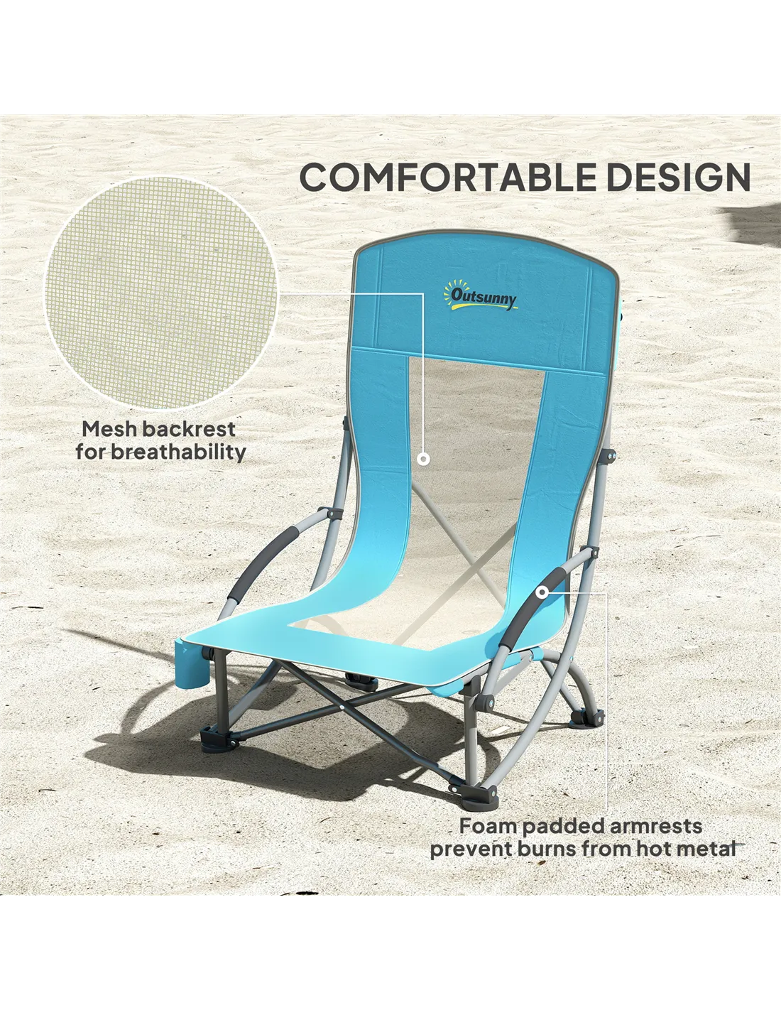 Discover the ease of outdoor relaxation with the Outsunny beach chairs set of 2. This lightweight, portable chair, weighing just 2.7kg, comes with a handy carry bag for effortless transport. Great as a folding low beach chair, it features a mesh backrest for breezy comfort and foam-padded armrests to prevent discomfort from hot metal, complete with a built-in cup holder.