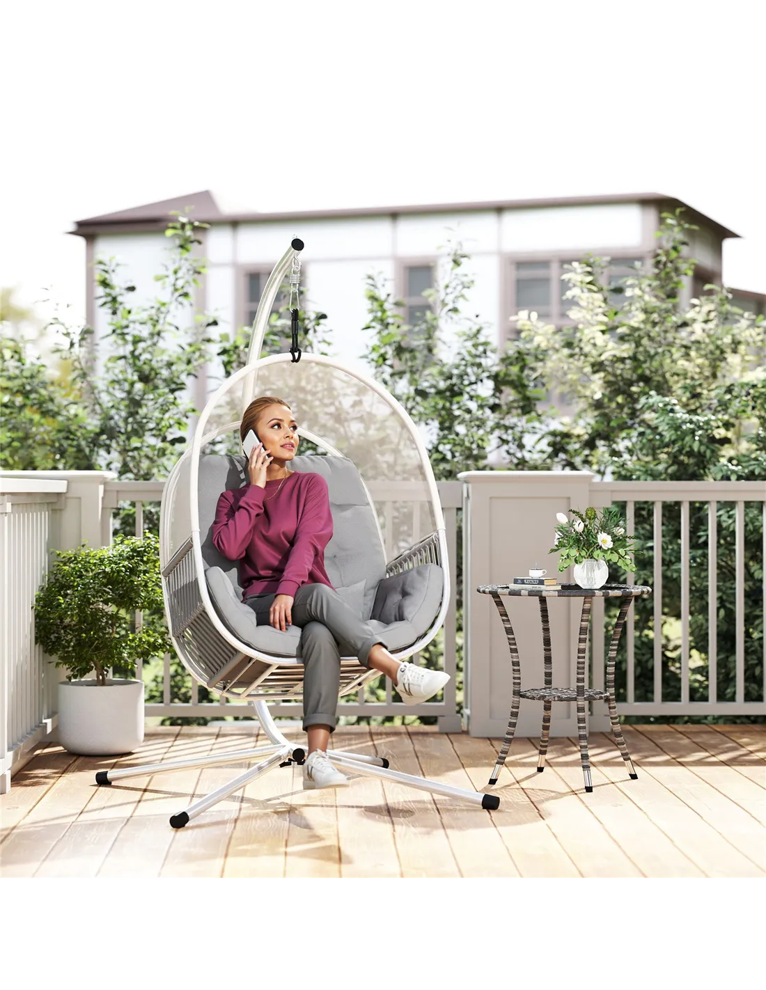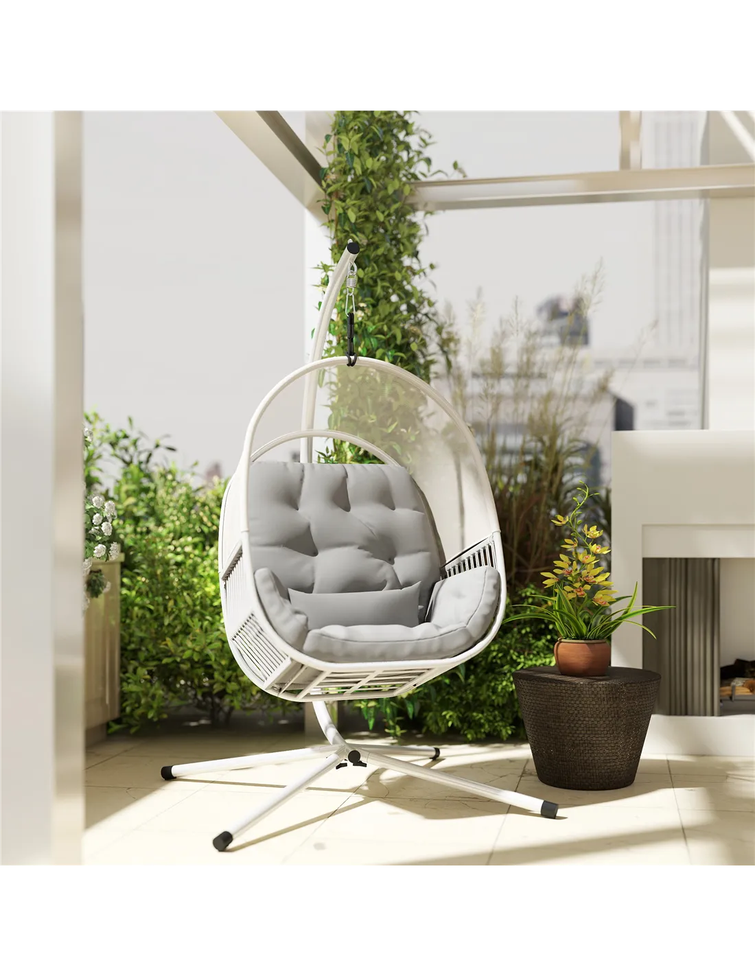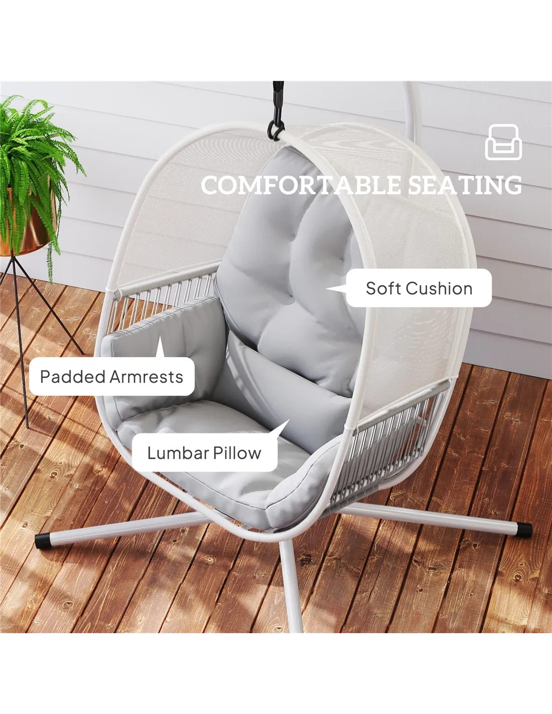 Based on reviews from our customers, the Outsunny hanging egg chair is praised for its sturdy construction and elegant design. Many highlight the breathable mesh fabric and plush cushions as key factors in their comfort. Users appreciate the removable lumbar pillow, which provides excellent back support during extended use. The powder-coated steel frame and balanced "X" stand receive positive remarks for stability and durability, even in outdoor settings. Overall, buyers commend the chair for transforming their garden or indoor space into a relaxing retreat.