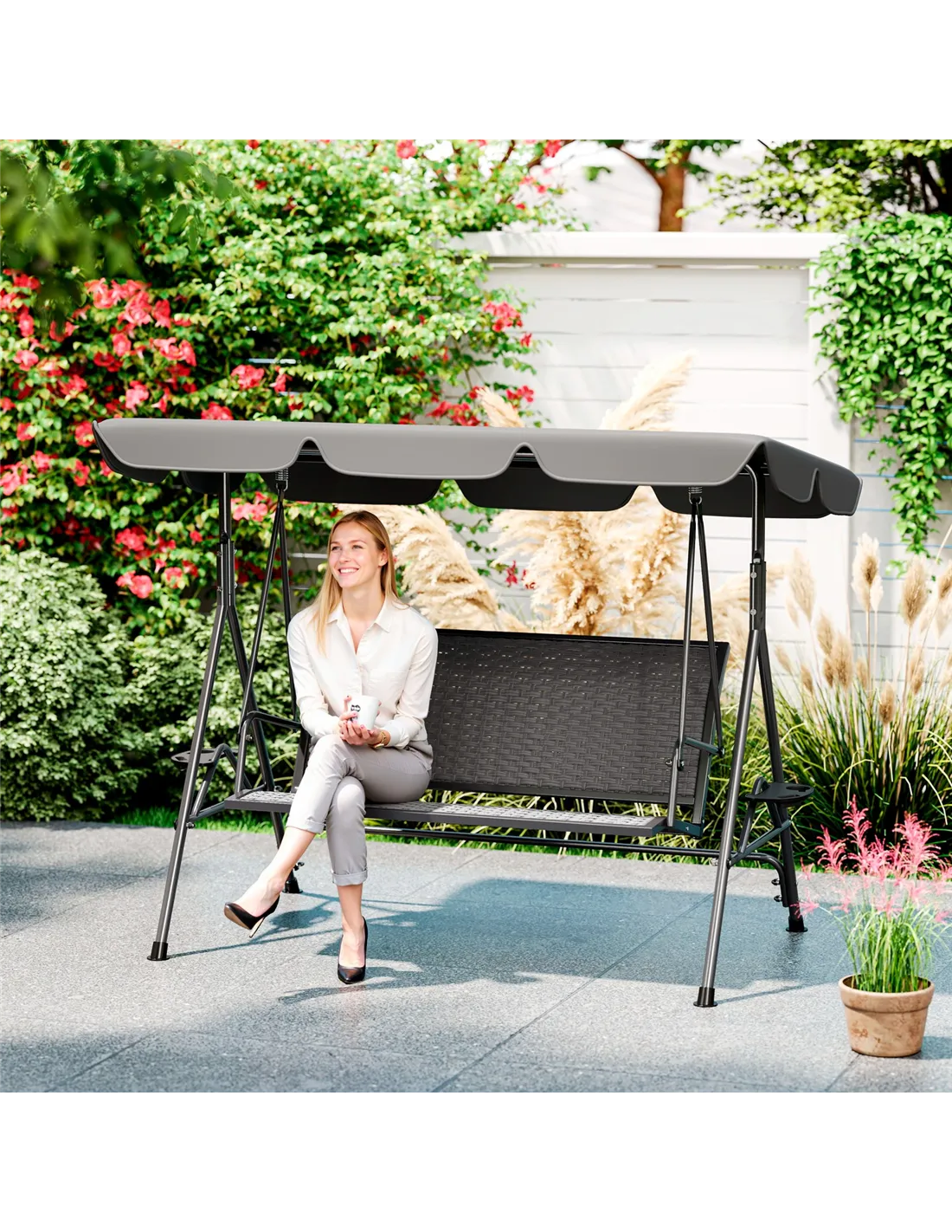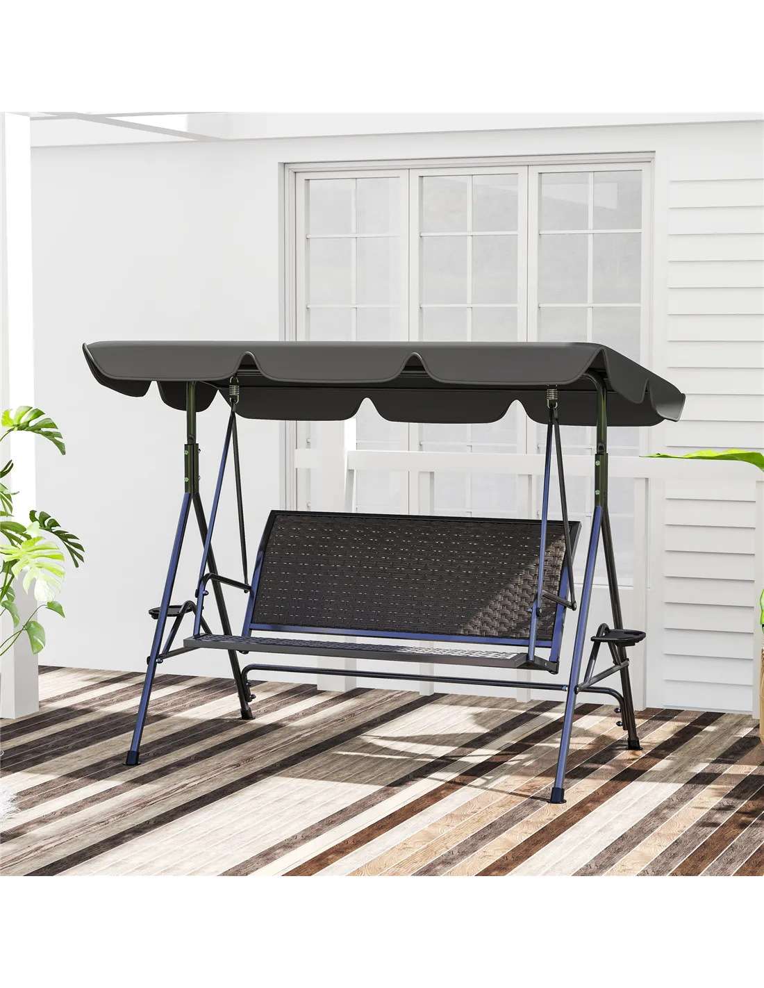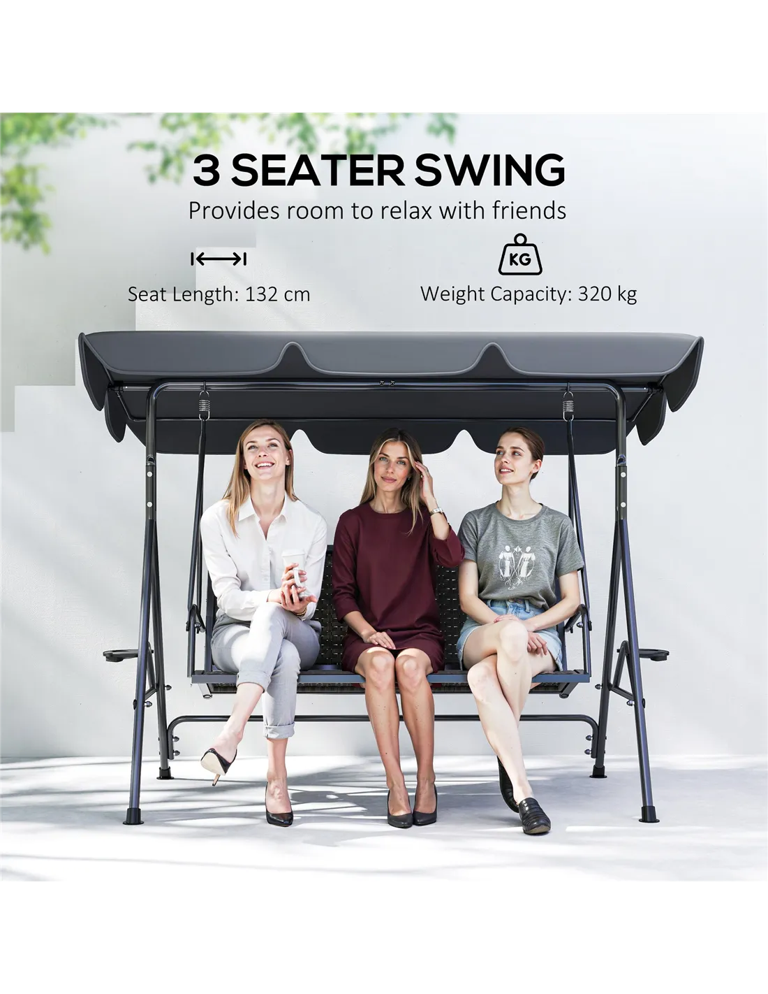 Outsunny 3 Seater Swing Chair, Garden Swing Seat Bench with Adjustable Canopy, Rattan Seat and Steel Frame for Patio, Yard, Grey
