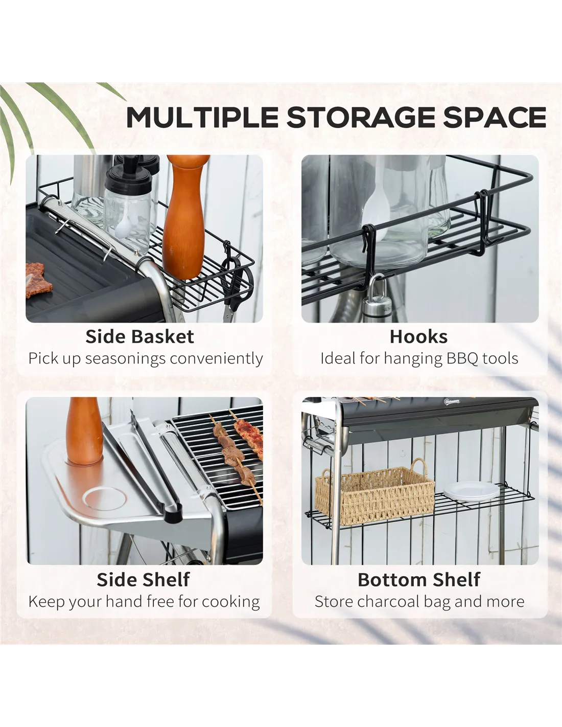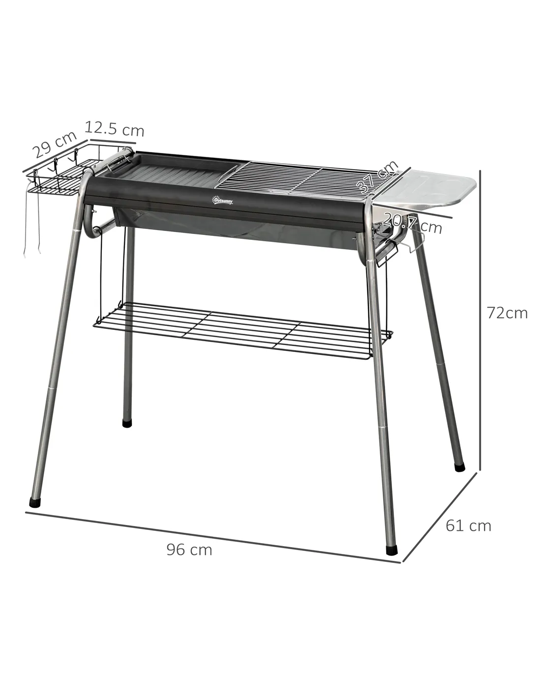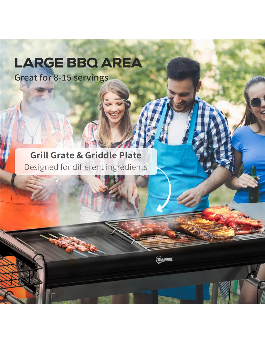 The Outsunny charcoal BBQ grill is perfect for a variety of outdoor occasions across the UK. Whether hosting a garden party, enjoying a camping trip, or tailgating at your favourite sporting event, this versatile grill delivers excellent results. Its spacious cooking surface comfortably serves 8-15 people, making it ideal for family gatherings or social barbecues. The included grill grate and griddle plate allow you to prepare a range of dishes, from succulent steaks to delicate vegetables. With side shelves and a seasoning basket, all your utensils and spices stay within easy reach, enhancing your cooking experience. Thanks to its sturdy construction and anti-slip feet, it remains stable on uneven ground, whether in your backyard or on a hiking adventure. Assembly is straightforward, requiring only the attachment of the legs, so you can quickly set up and start cooking.