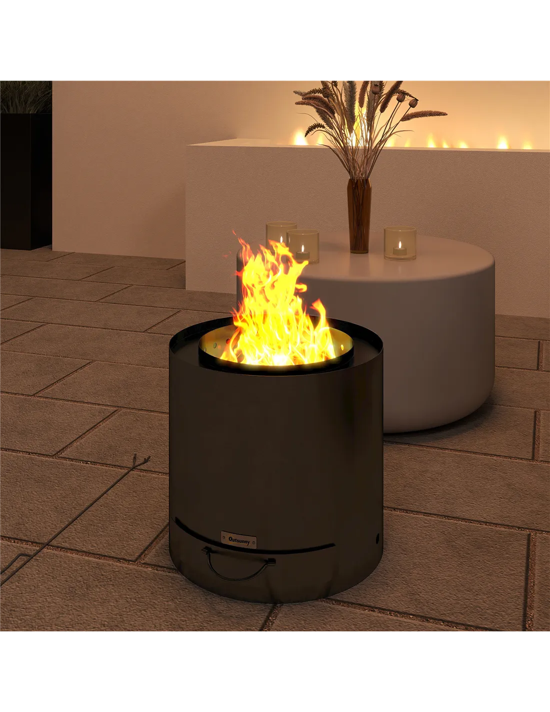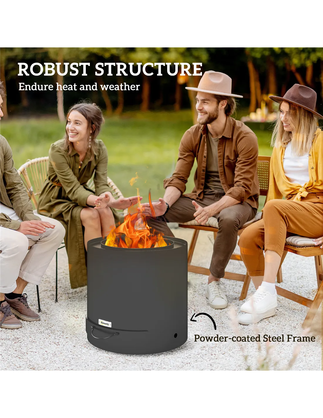 The fire pit is constructed from heat-resistant, powder-coated steel, ensuring durability and resistance to wear and weather.
